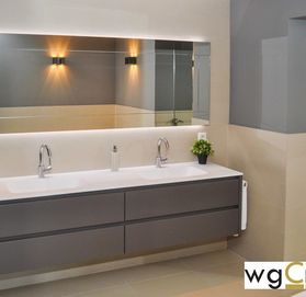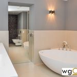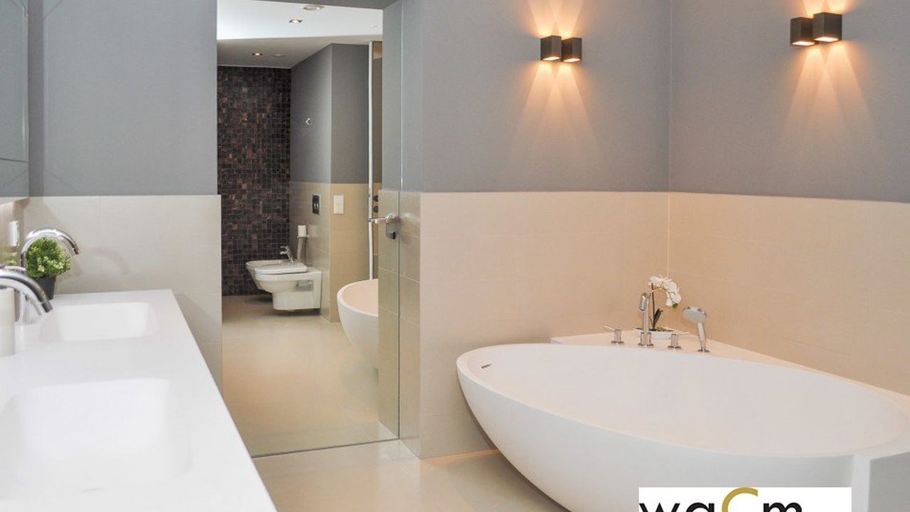 Стильные туалетная и ванная комнаты, включающая ванну, душ, двойную раковину, унитаз и биде, а также подогрев и охлаждение пола, контролируемое приложением.