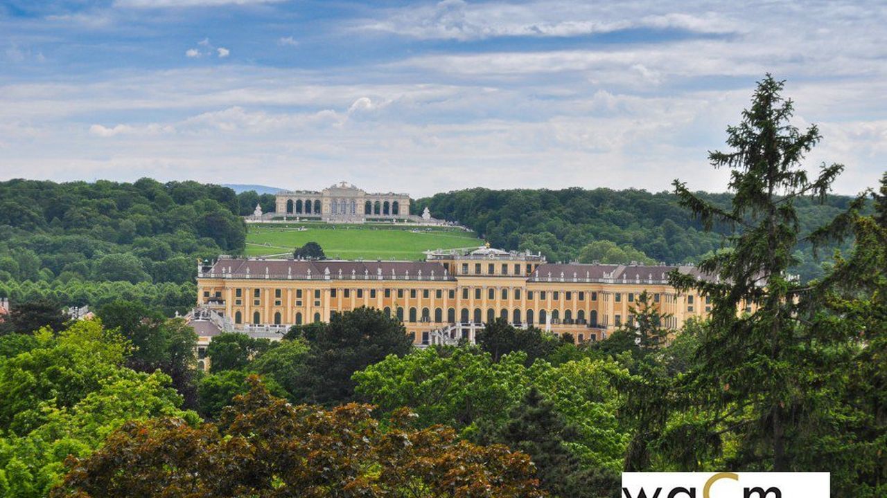 Прекрасный вид с террасы на дворец Шенбрунн.