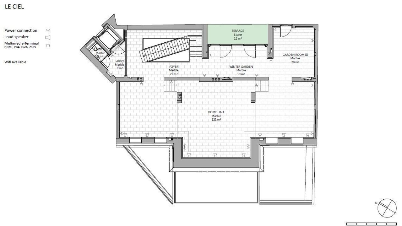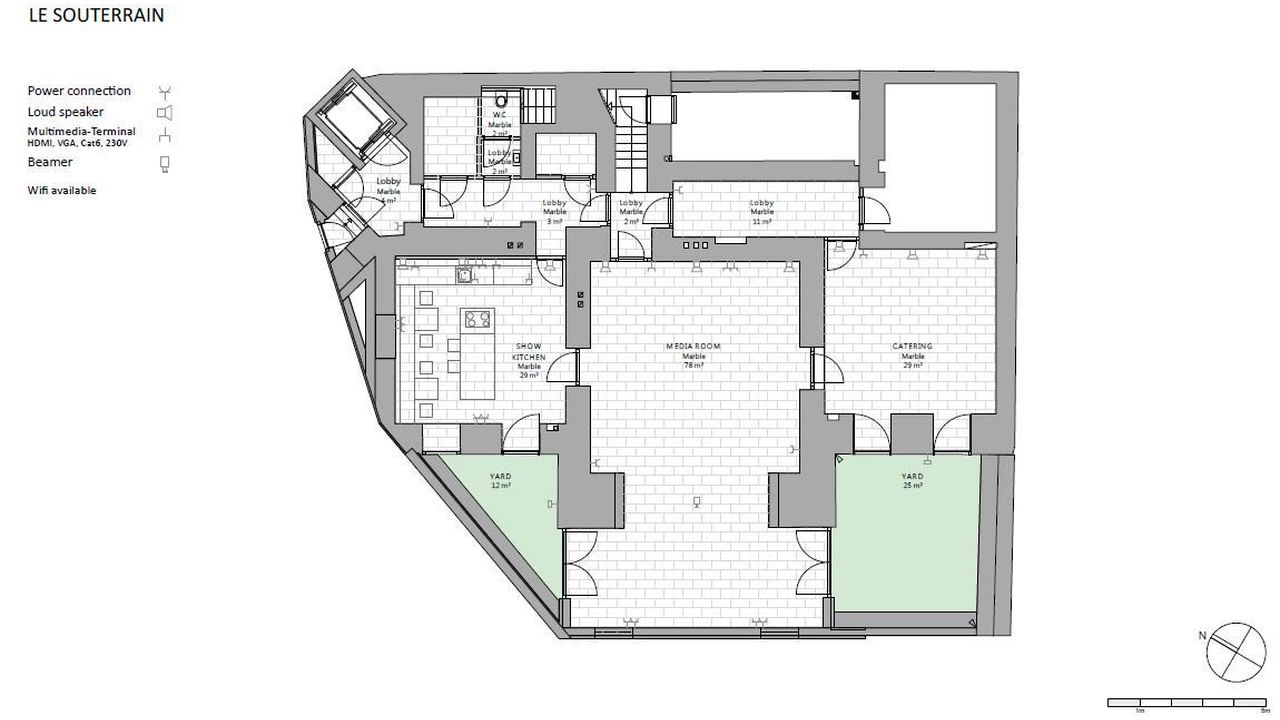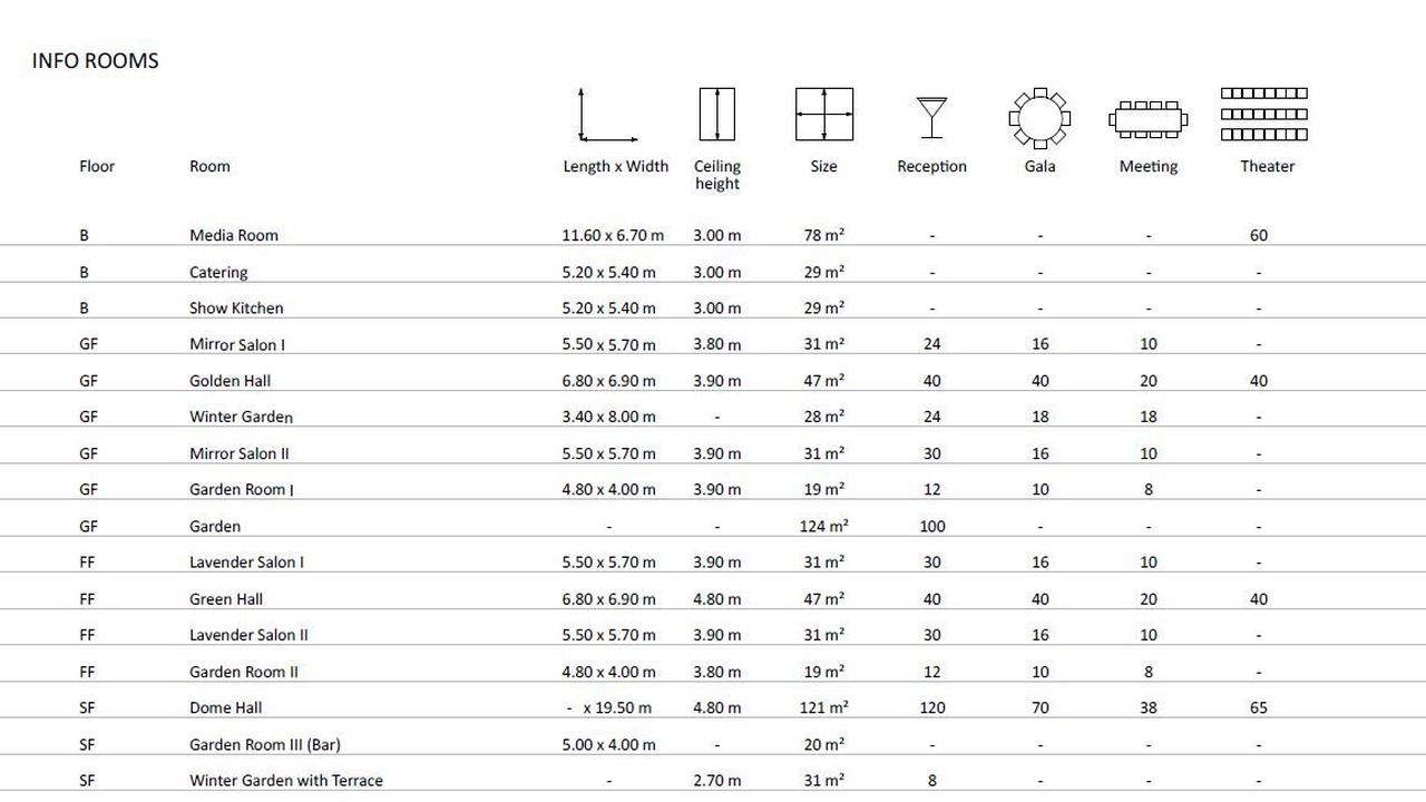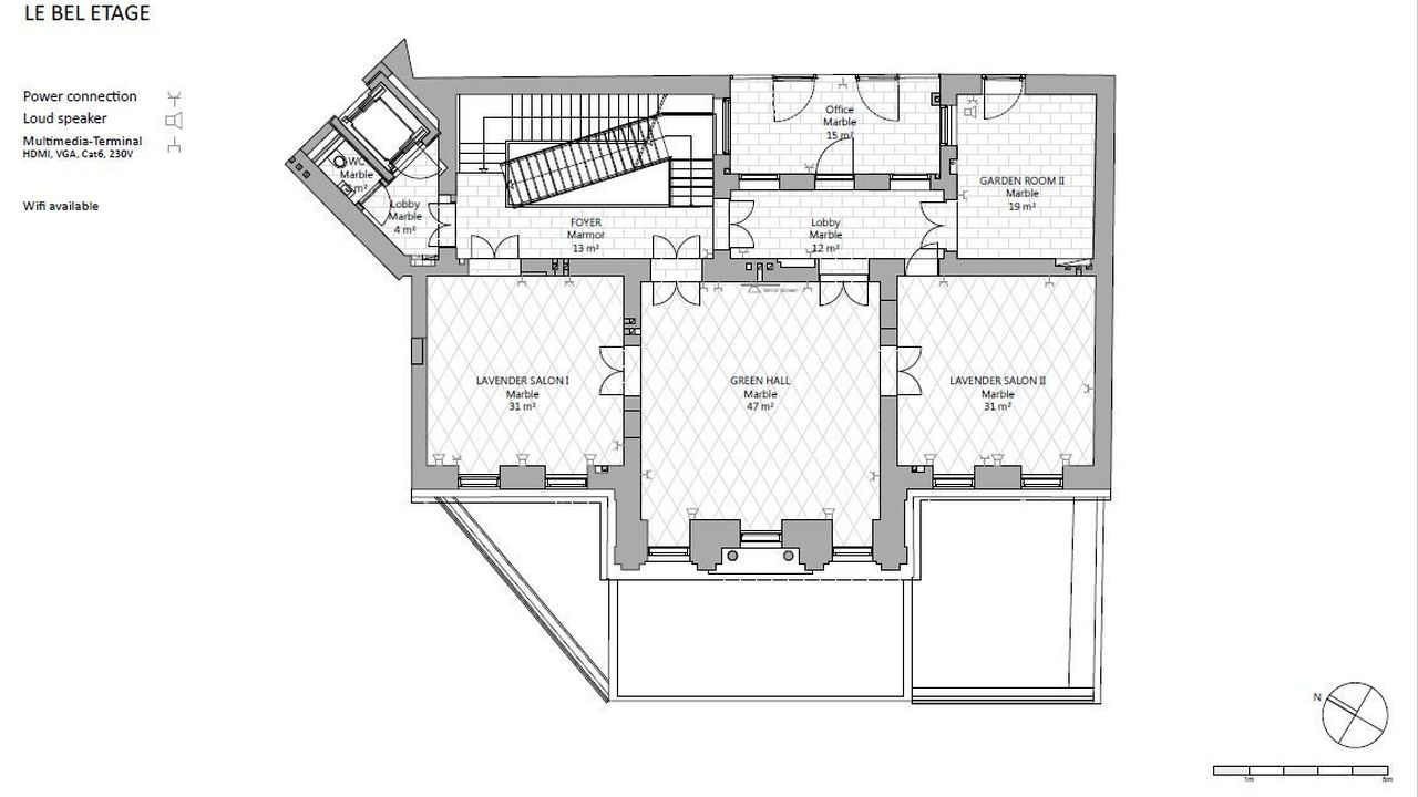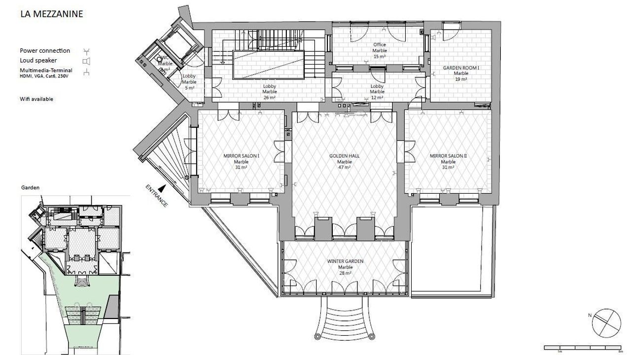 На собственной подземной автостоянке отеля есть четыре парковочных места; Кроме того, можно арендовать или приобрести до 27 дополнительных парковочных мест. При необходимости можно приобрести еще две зоны в отремонтированном старом здании, каждая из которых имеет полезную площадь около 200 м2 (расположена на 1-м этаже или в мезонине); Эти районы находятся на лифте, напрямую связанном с дворцом.