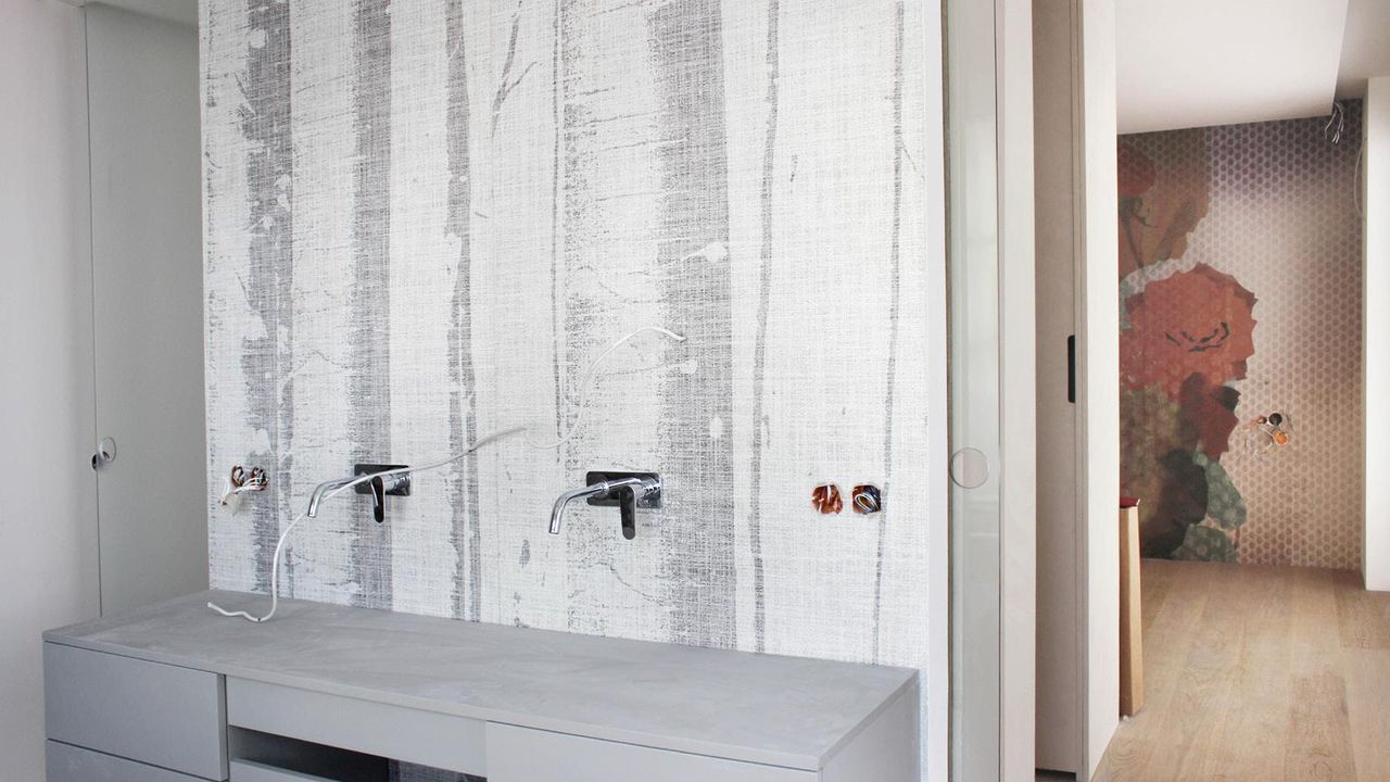 Обои: inkiostro Bianco (Италия) окрашенные с потертостью Полупрозрачный цвет дисперсии, сломанный белый, теплый серый и бежевый
