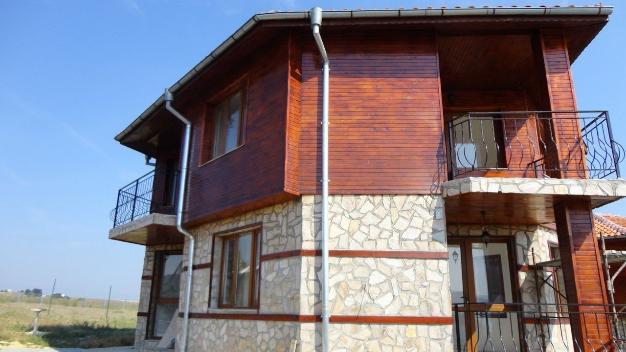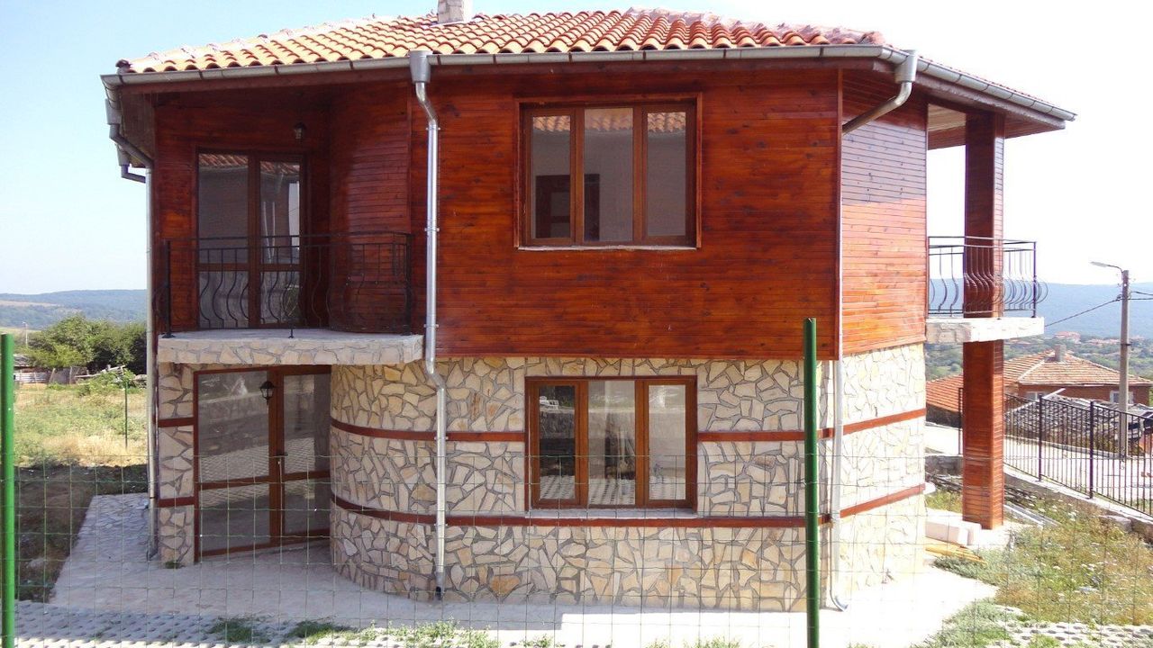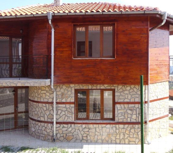 Дом двухэтажный, снаружи облицован деревом и камнем, с полной отделкой внутри: стены покрашены латексом, пол покрыт терракотой, ванные и туалеты оборудованы сантехникой.