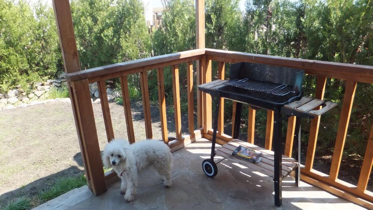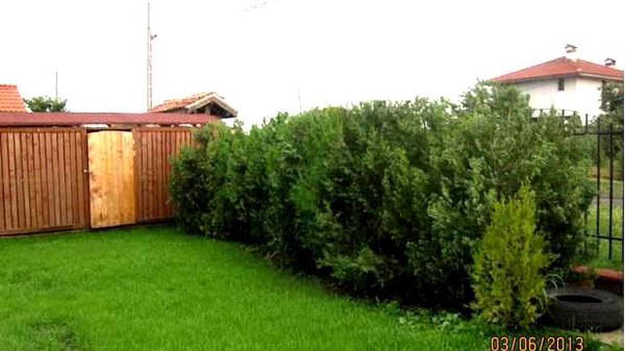 Дворовый участок площадью 535 кв. м, приятно озеленен. В нем расположен навес для барбекю, небольшой декоративный бассейн и гараж.