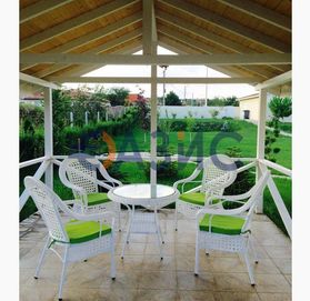 Трава-газон, лаванда, розы , сирень, тюльпаны. Полив из колодца поливная система управляется автоматически. Сзади дома фруктовый сад : черешня, яблоки, груши, инжир, вишня, колоновидные груши и яблоки. 4 куста столового винограда, капельный полив.