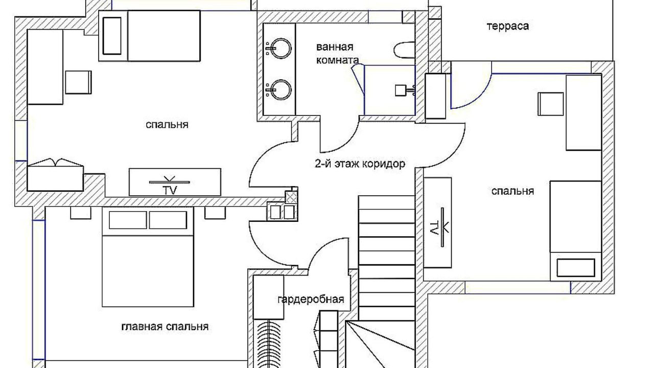 На первом этаже дома полностью оборудованная самостоятельная кухня, просторная гостиная с открытой обеденной зоной, ванная с туалетом, прачечное помещение и кабинет; а на втором этаже расположились 3 спальни, ещё одна ванная с туалетом и гардеробная комната.