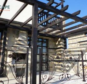 There is a veranda in front of every house that has a pergola with a winding vineyard. There is also an outside fireplace on each veranda giving great views of the mountain.