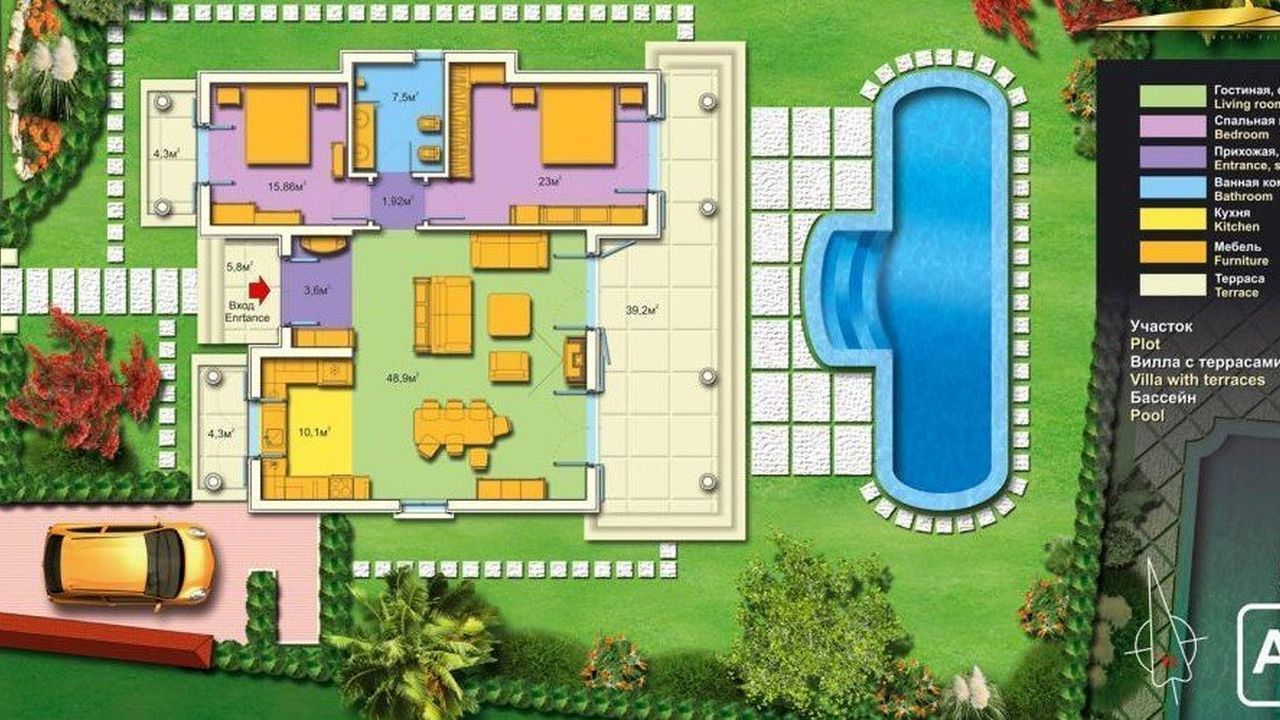 Территория комплекса богато озеленена, каждый дом имеет свой бассейн - прямо перед входом, размер бассейна данной виллы - 42 кв.м.