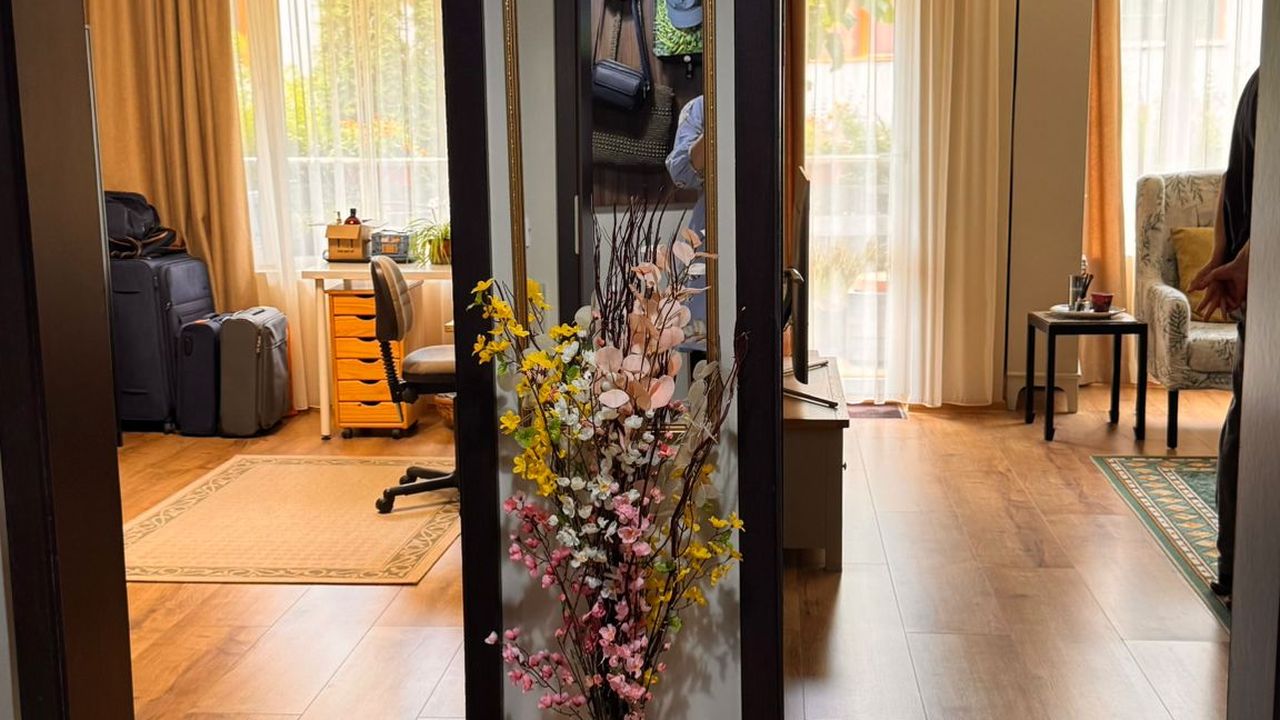 Объект расположен на первом этаже и состоит из двух соединенных квартир. Планировка следующая - прихожая, просторная гостиная, кабинет, гардеробная, терраса с видом на благоустроенный двор, ванная комната с туалетом и душевой кабиной, коридор, большая столовая с отдельной кухней, уютная спальня, вторая ванная комната с туалетом и душевой кабиной, еще одна терраса с видом на двор. Общая площадь двух квартир составляет 151 кв.м.
