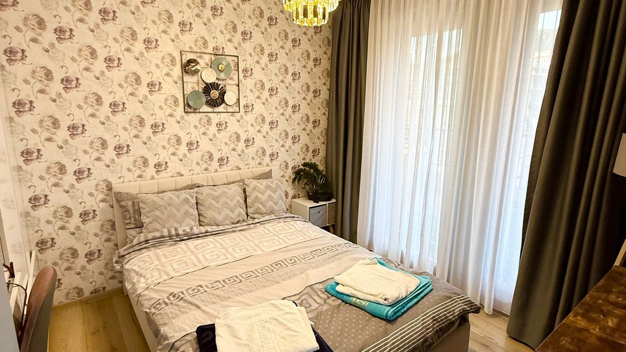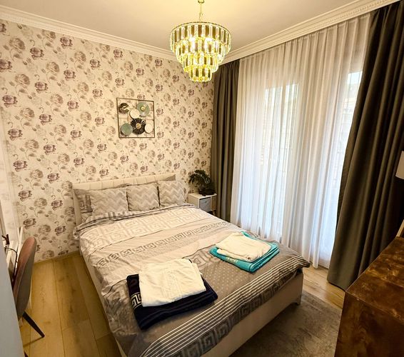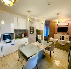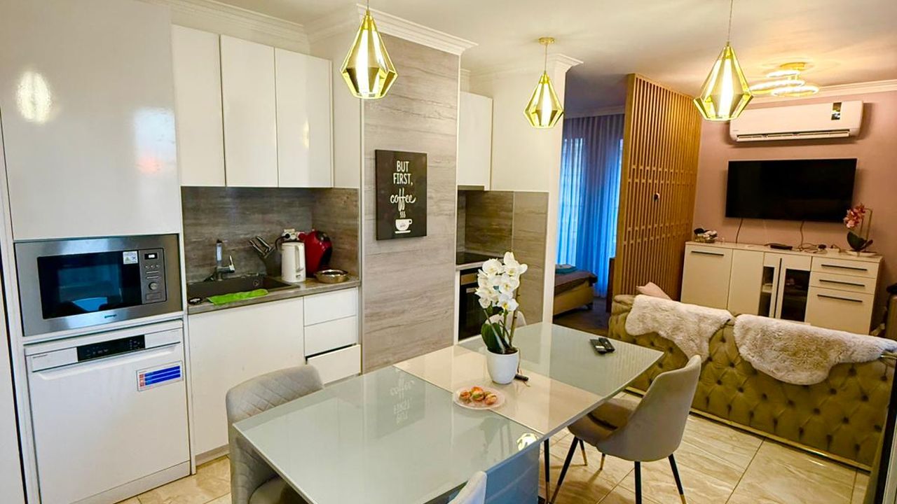 Апартаменты роскошно меблированы и расположены на последнем этаже здания. Они состоят из прихожей, гостиной с кухней и обеденной зоной, отдельной спальни, ванной комнаты с туалетом и душевой кабиной, просторной террасы с джакузи и невероятным видом на море и горы. Недвижимость продается полностью меблированной, обставленной качественной и роскошной мебелью и оснащенной всей необходимой бытовой техникой.