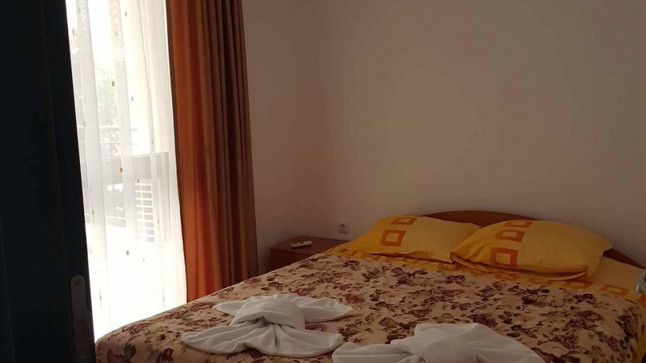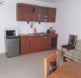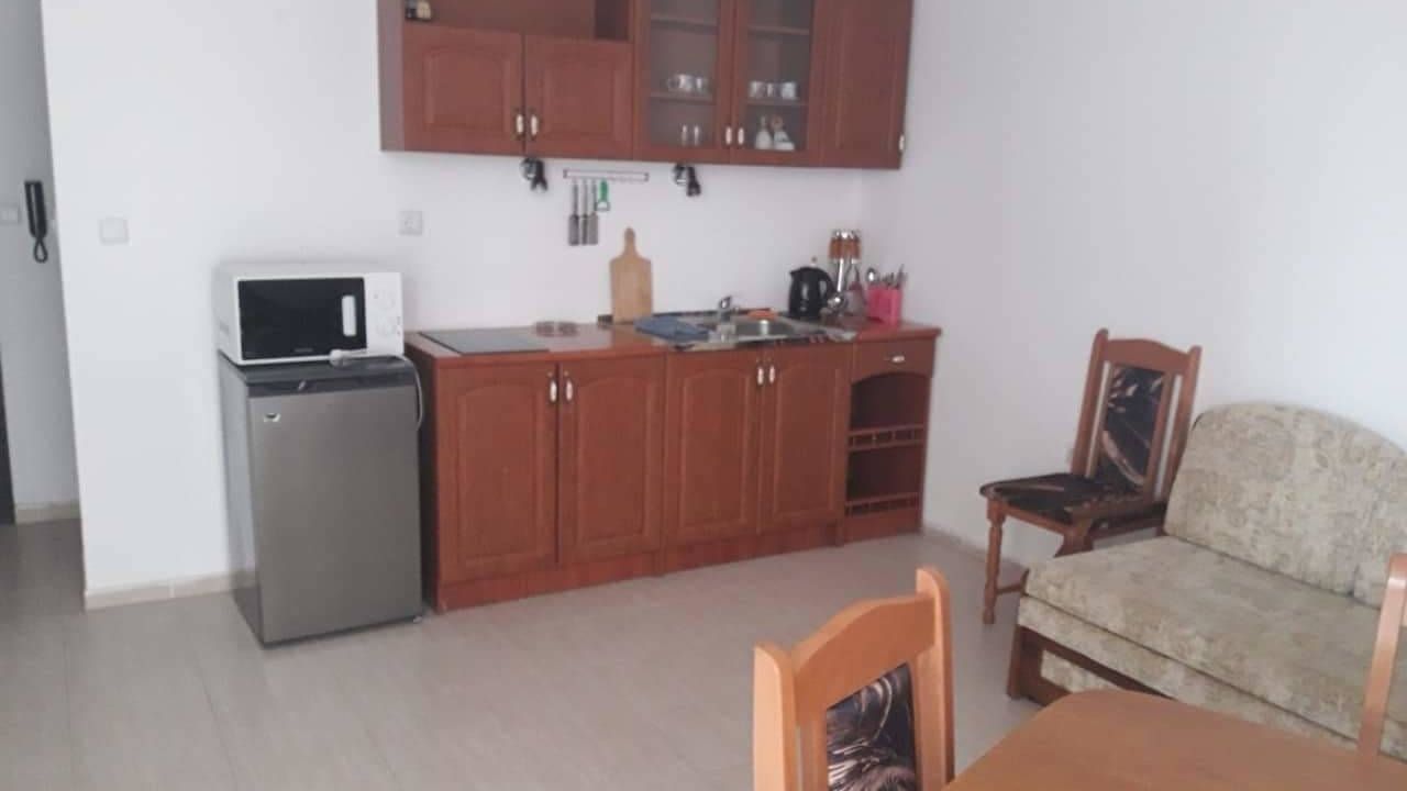 Апартамент состоит с коридора, просторной кухонной зоны с зоной отдыха и террасы; 1 спальни, с выходом на террасу, ванной комнаты. Мебель и техника остаются в квартире, установлены кондиционеры, автономное отопление. До моря 700 метров. До центра Солнечного берега 10 минут ходьбы, до аэропорта 30 км.