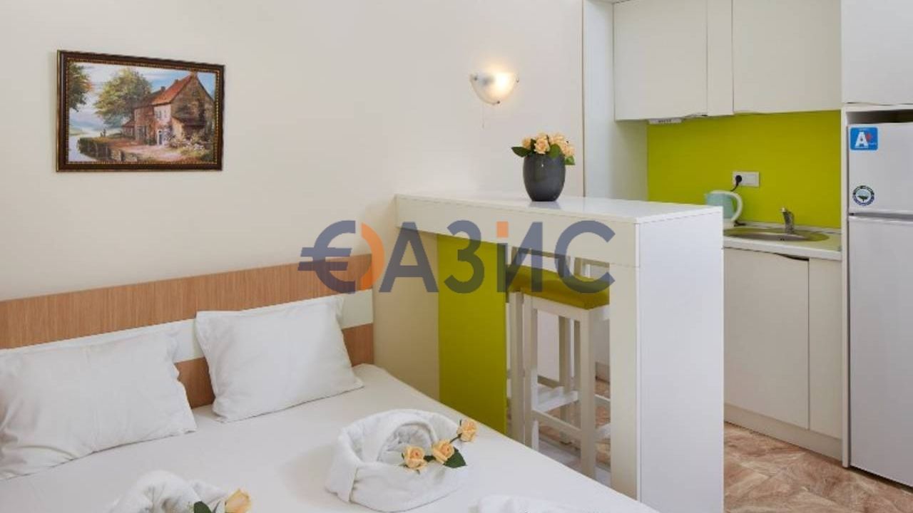 Студия состоит с коридора, просторной кухонной зоны с зоной отдыха и террасы с видом на горы; зоны отдыха - спальни, ванной комнаты. Мебель и техника остаются в квартире. До моря 150 метров. До центра Святого Власа 200 метров, до аэропорта 35 км.