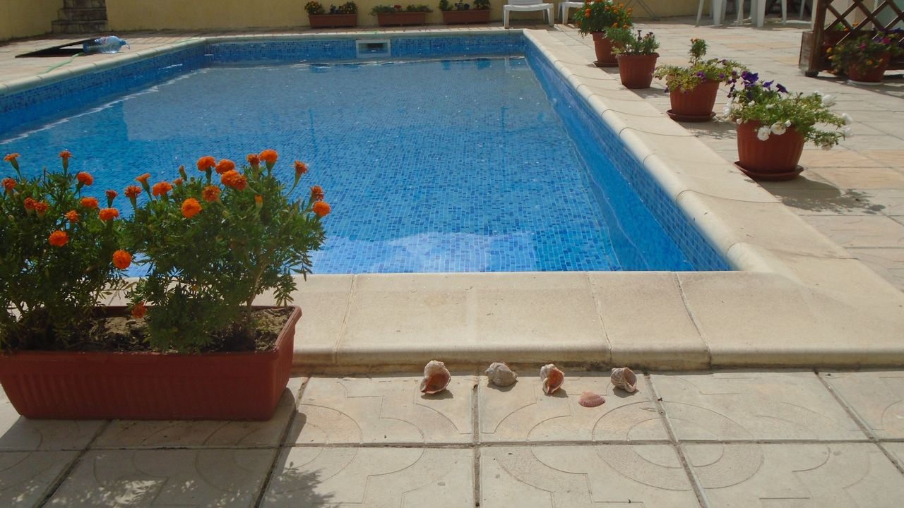 Около бассейна мебель: лежаки, стол и стулья.