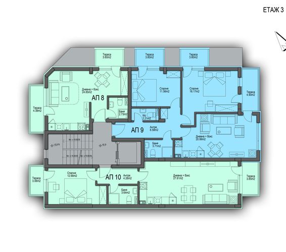 В жилом здании можно приобрести одно- двух- и трёхкомнатные апартаменты, вместе с ними можно купить и парко-место в подземной парковке, а также гараж.