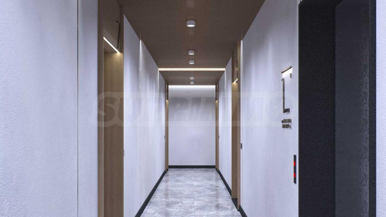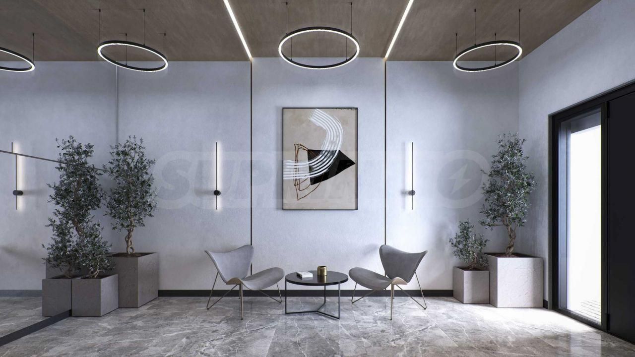 • The turnkey completed apartments are issued with high-class materials - flooring made of porcelain stoneware or laminated parquet, finely plastered and painted with latex paint walls and ceilings, Schneider Electric plugs and switches are installed, installed interior doors, fully finished bathrooms and toilets with faience and all accessories including shower cabins, toilet bowls with built-in structure, sinks, etc. Lighting fixtures and furniture are not included.