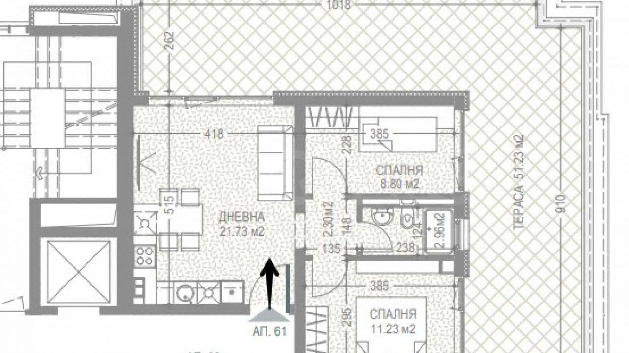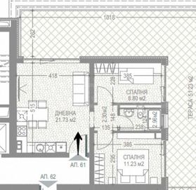 The apartment No61 is located on the 6th floor and consists of two bedrooms, living room, terrace, bathroom/toilet.