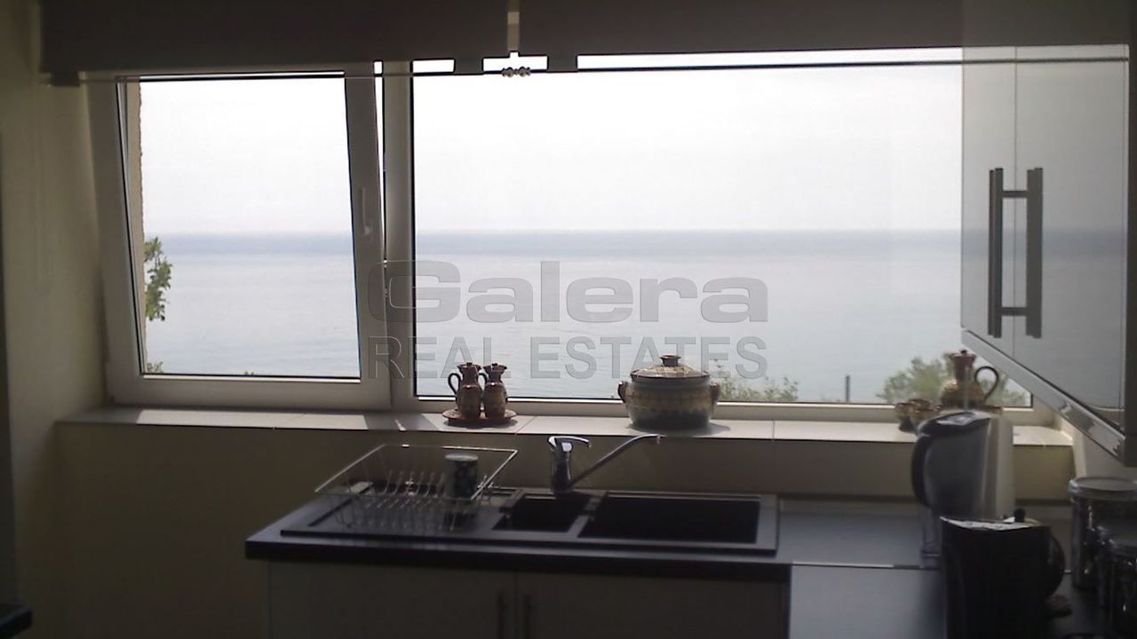 На первом этаже размещены гостиная с кухней с обособленной зоной для отдыха и местом для столовой, полностью оборудованный санузел. Гостиная выходит на просторную веранду с панорамным видом. На втором этаже расположены две спальные комнаты, каждая с балконом, ванная комната, туалет. На цокольном этаже обустроена самостоятельная квартира, состоящая из одной комнаты с кухней и санузла. Этот дом с захватывающим видом на море, обеспечивает владельцам тишину и уют, а в благоустроенном и озелененном дворе, площадью 2100 м2, предусмотрены места для парковки.