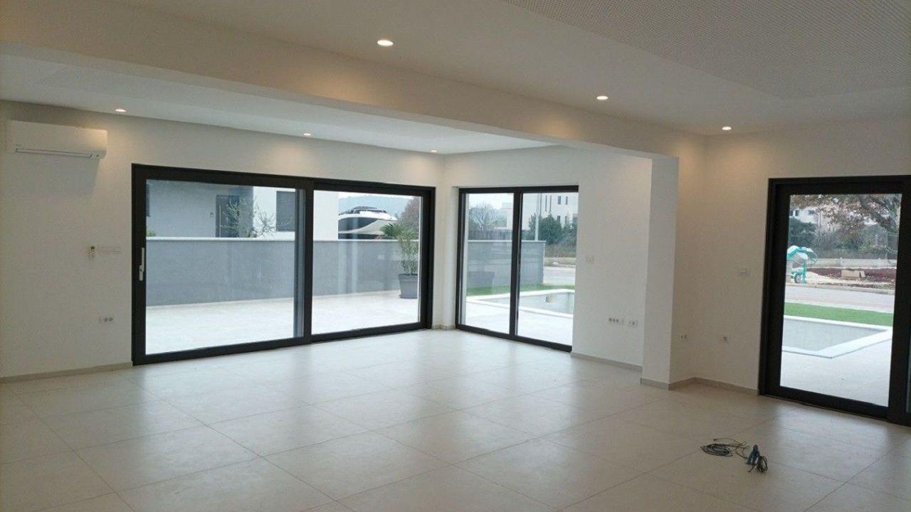 Первый этаж: вход в зал, слева от зала - большая гостиная с кухней и столовой, доступ к саду и бассейну. Высокие потолки, потолочное освещение организовано. Гостиные доминируют стеклянные стены с алюминиевой партией.
