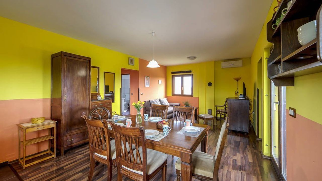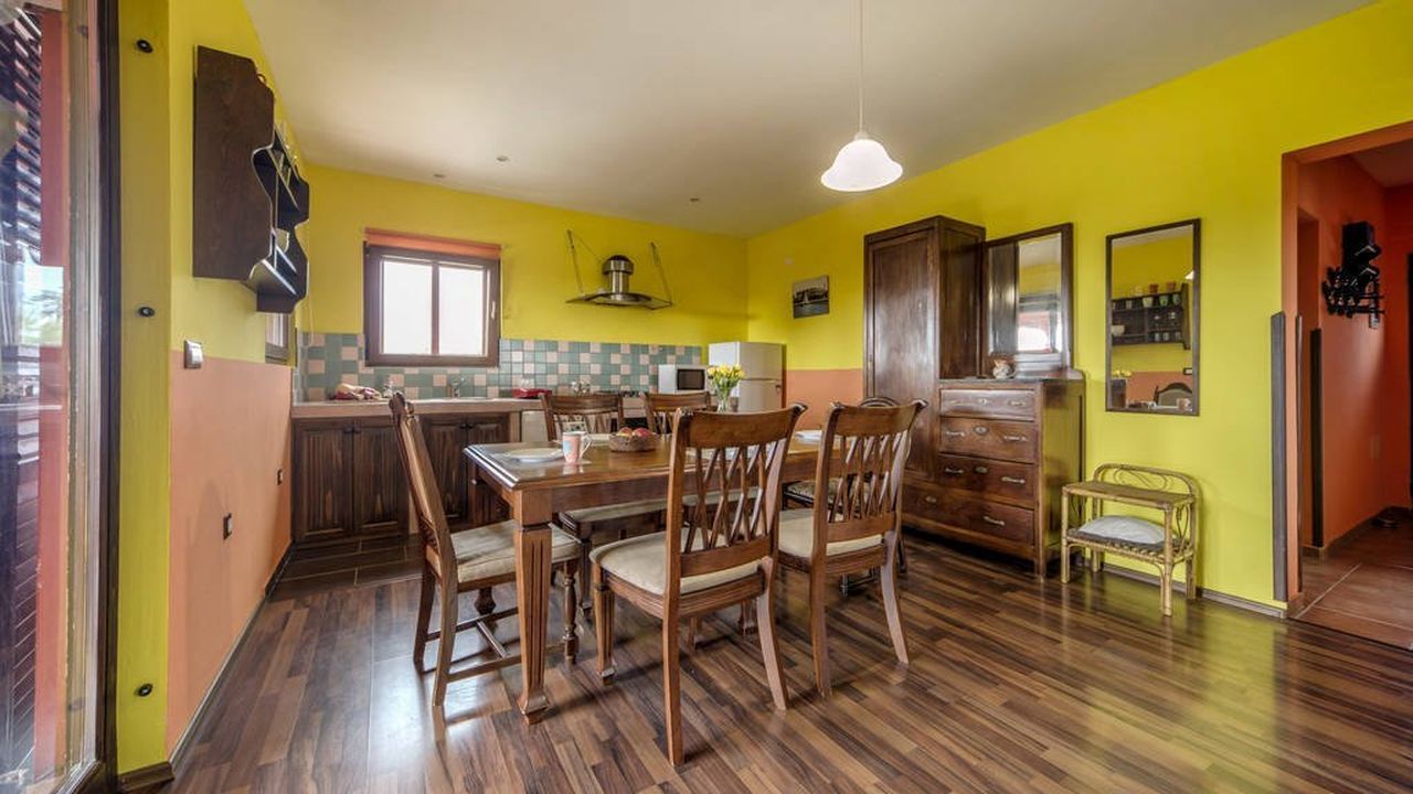 Первый этаж:кухня с гостиной и столовой, 2 спальные комнаты, ванная комната и терраса.