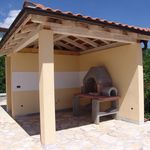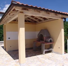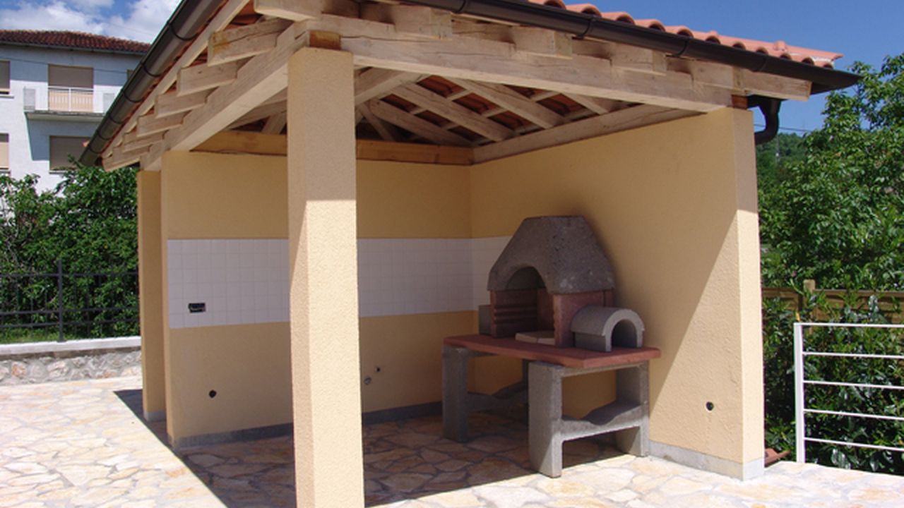 Есть камин, зона барбекю, металлическая ограда.