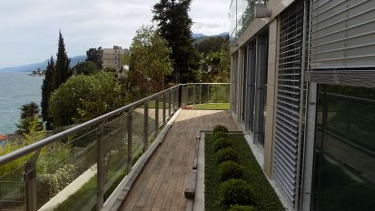 Предлагается квартира в закрытом элитном комплексе на берегу моря в Опатии. Комплекс с прямым выходом к морю находится на огороженной охраняемой территории, где царит атмосфера уединения и престижа; включает в себя три жилых малоквартирых здания, виллу, общий бассейн с подогревом и зону отдыха. Квартира с панорамным остеклением расположена на первом этаже и состоит из гостиной, объединенной с кухней-столовой, двух спален, ванной комнаты, дополнительного санузла, гардеробной и прихожей. Из гостиной выход ведет на большую видовую террасу 90 кв.м, засаженную растениями и цветами. Изо всех комнат открывается вид на море и остров Црес. В отделке использовались материалы известных производителей высочайшего класса, установлены новейшие инженерные технологии, что подтверждается наивысшей категорией энергетического сертификата А+. На цокольном этаже имеется гаражное место, кладовое помещение; на придомовой территории - парковочное место. Данное предложение является уникальным на элитном рынке Хорватии.