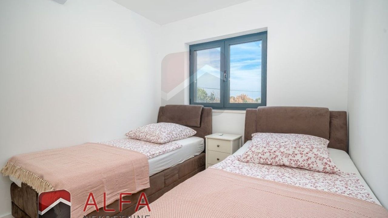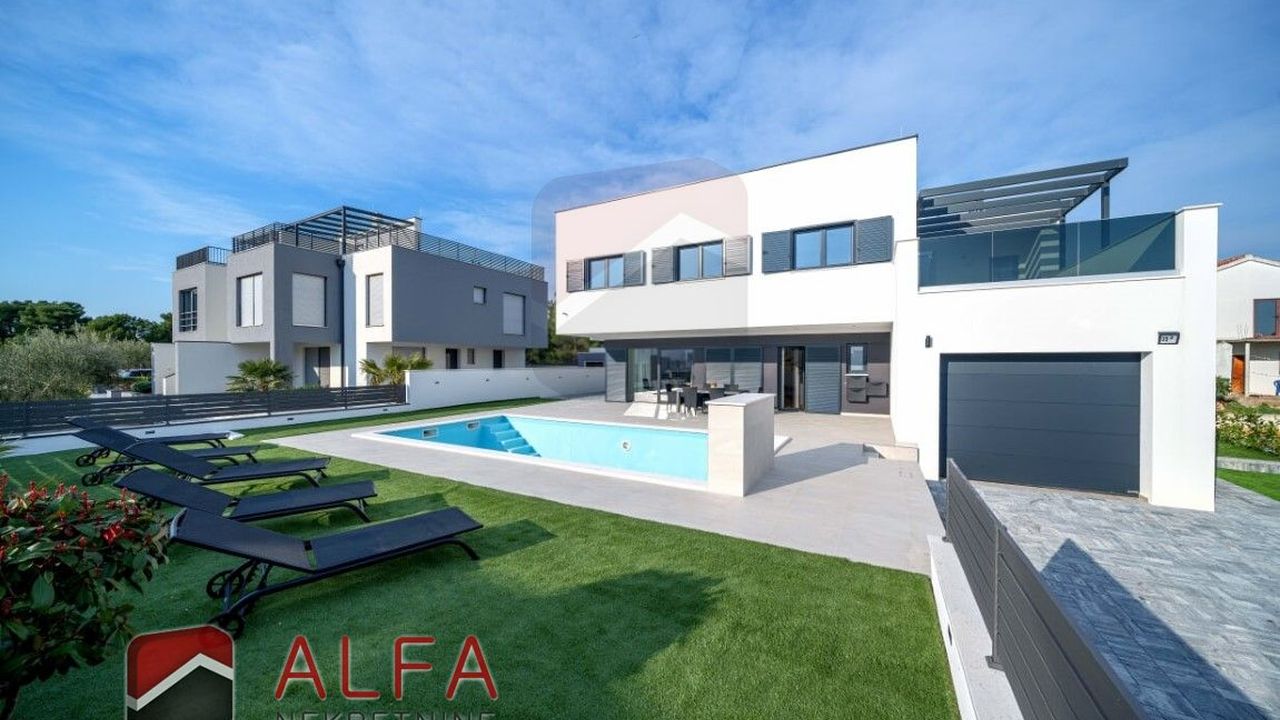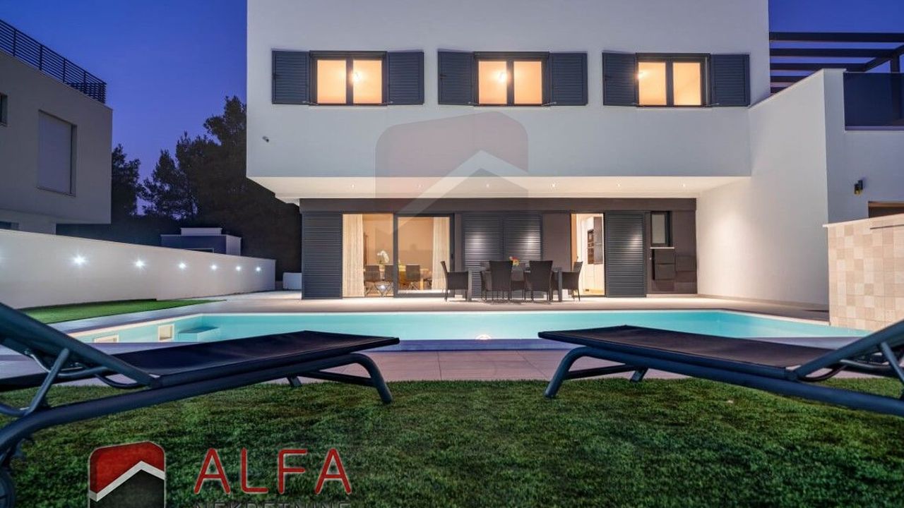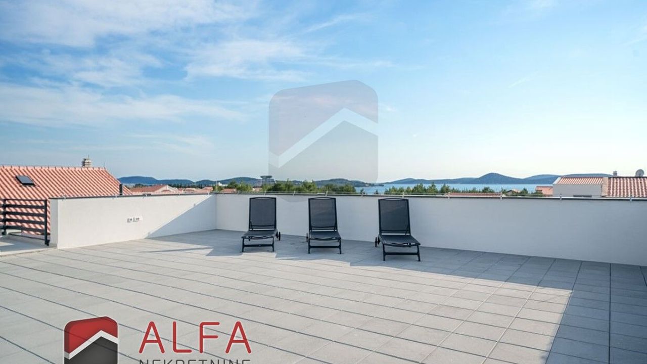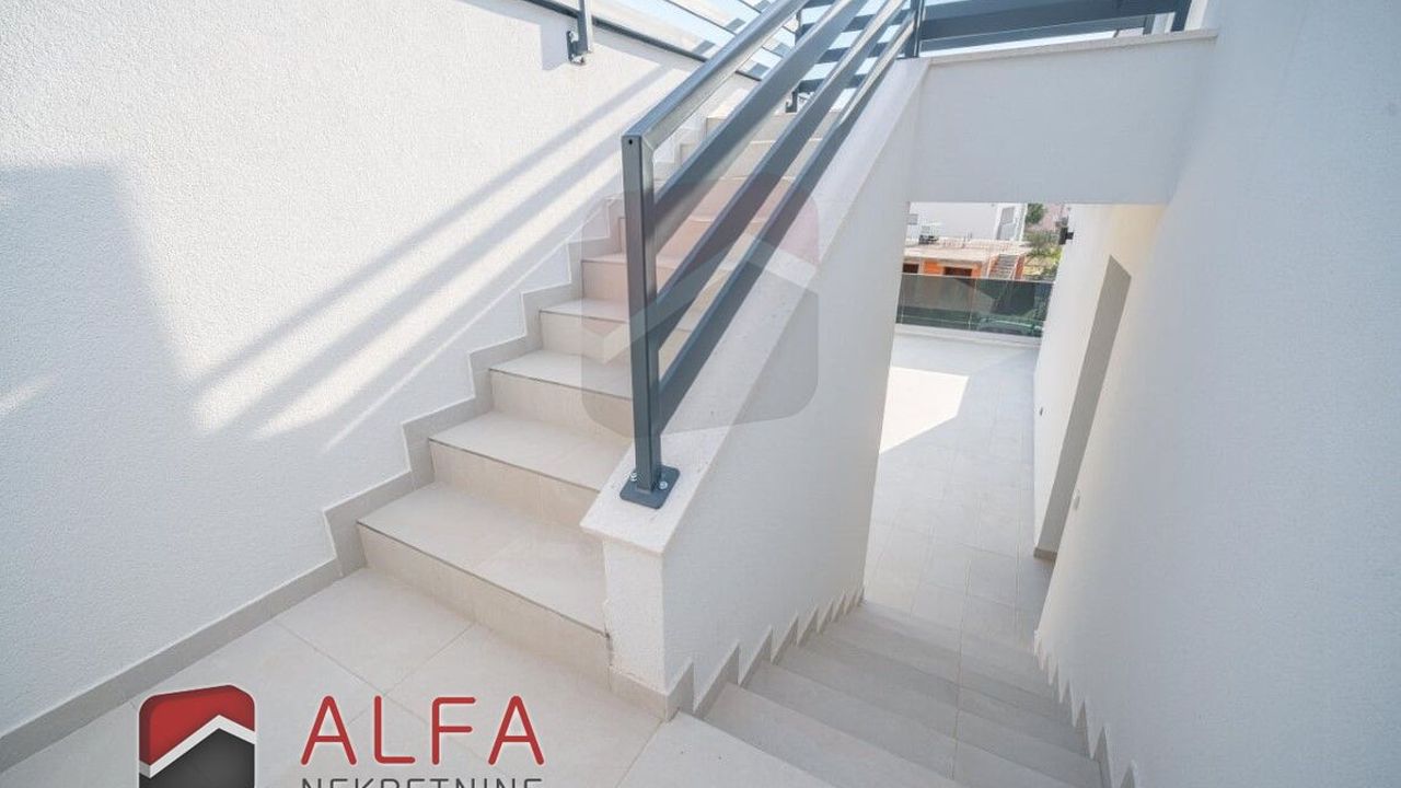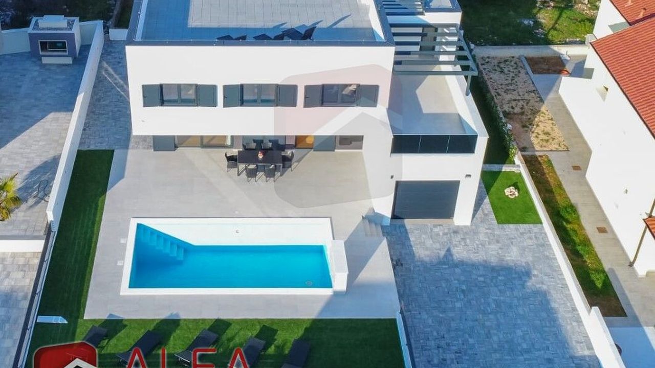 Хорватия, Водице, новая, очень удобная и роскошная отдельностоящая семейная вилла на продажу. Он расположен в тихом месте, в 800 м от моря. Общая площадь дома 240 м2 + терраса на крыше 96 м2, все находится на земельном участке 548 м2. Дом состоит из цокольного этажа, второго этажа и большой террасы на крыше с великолепным панорамным видом на море и город.