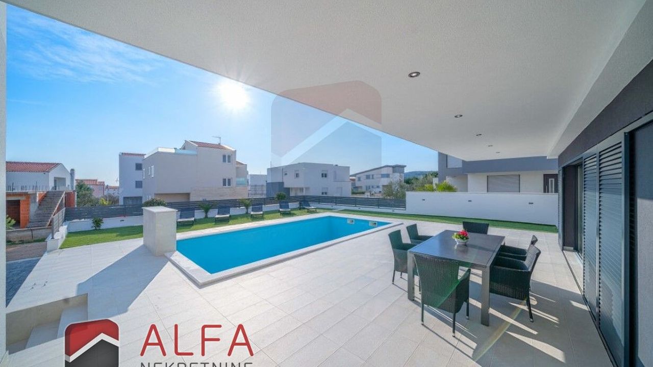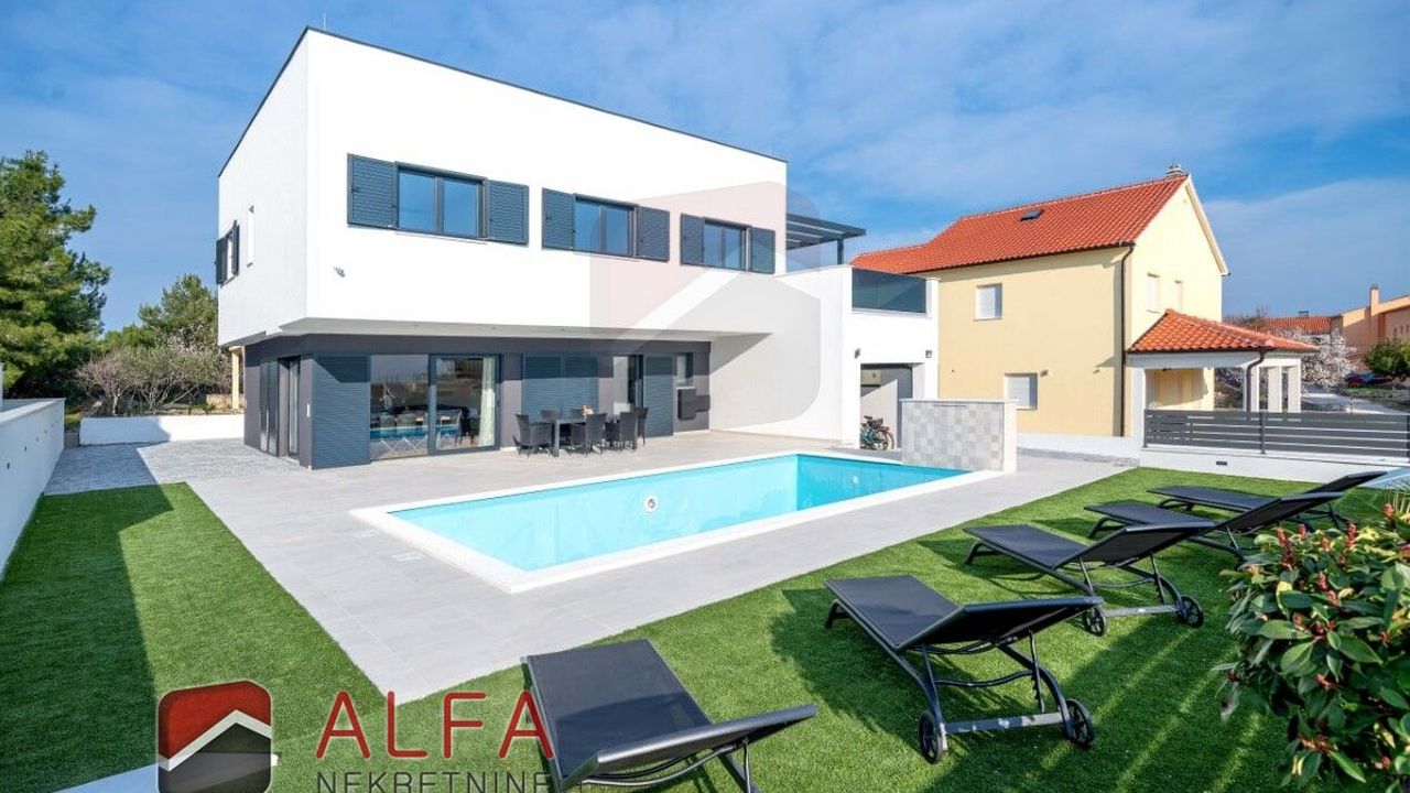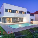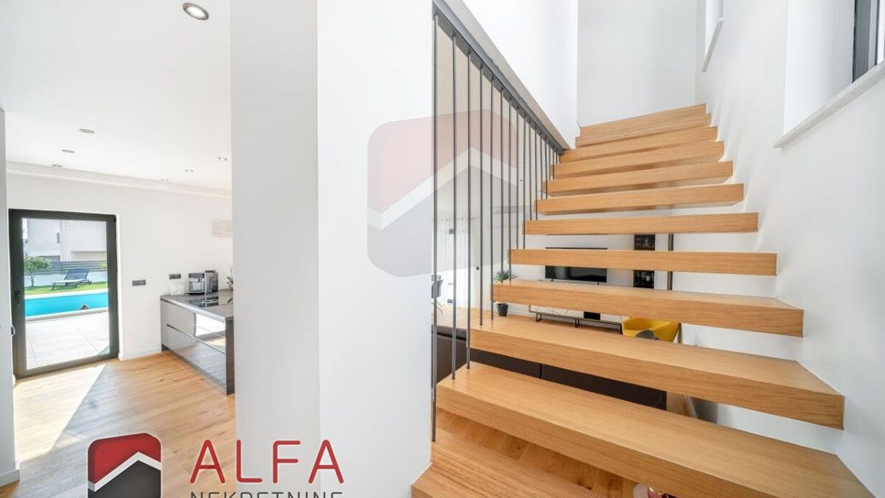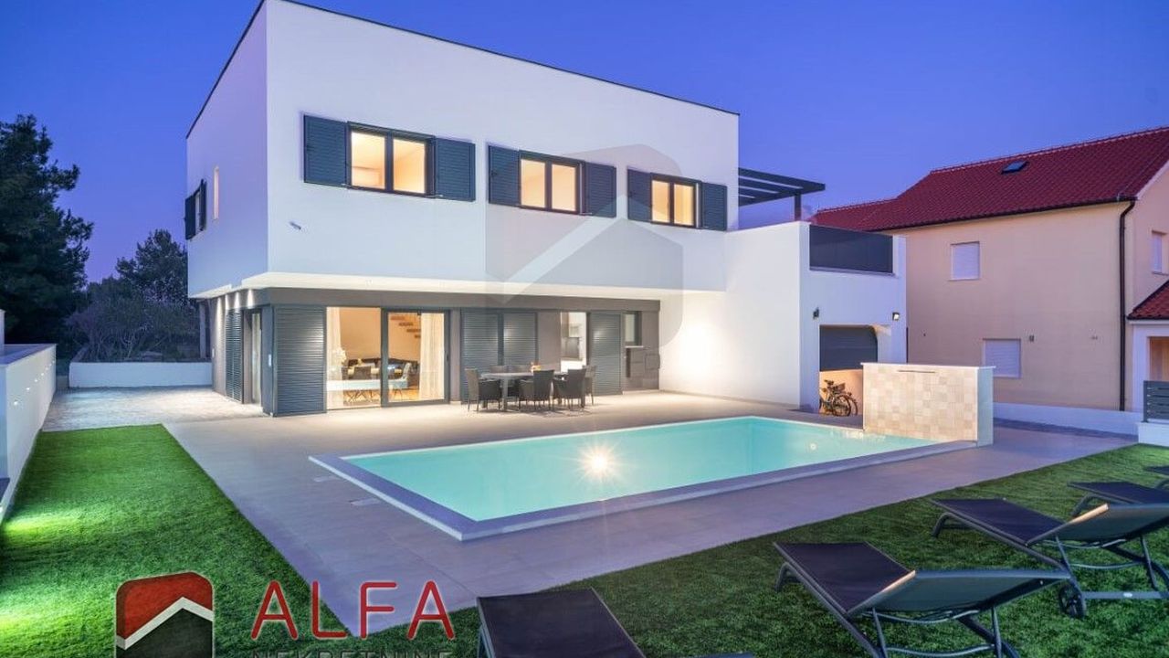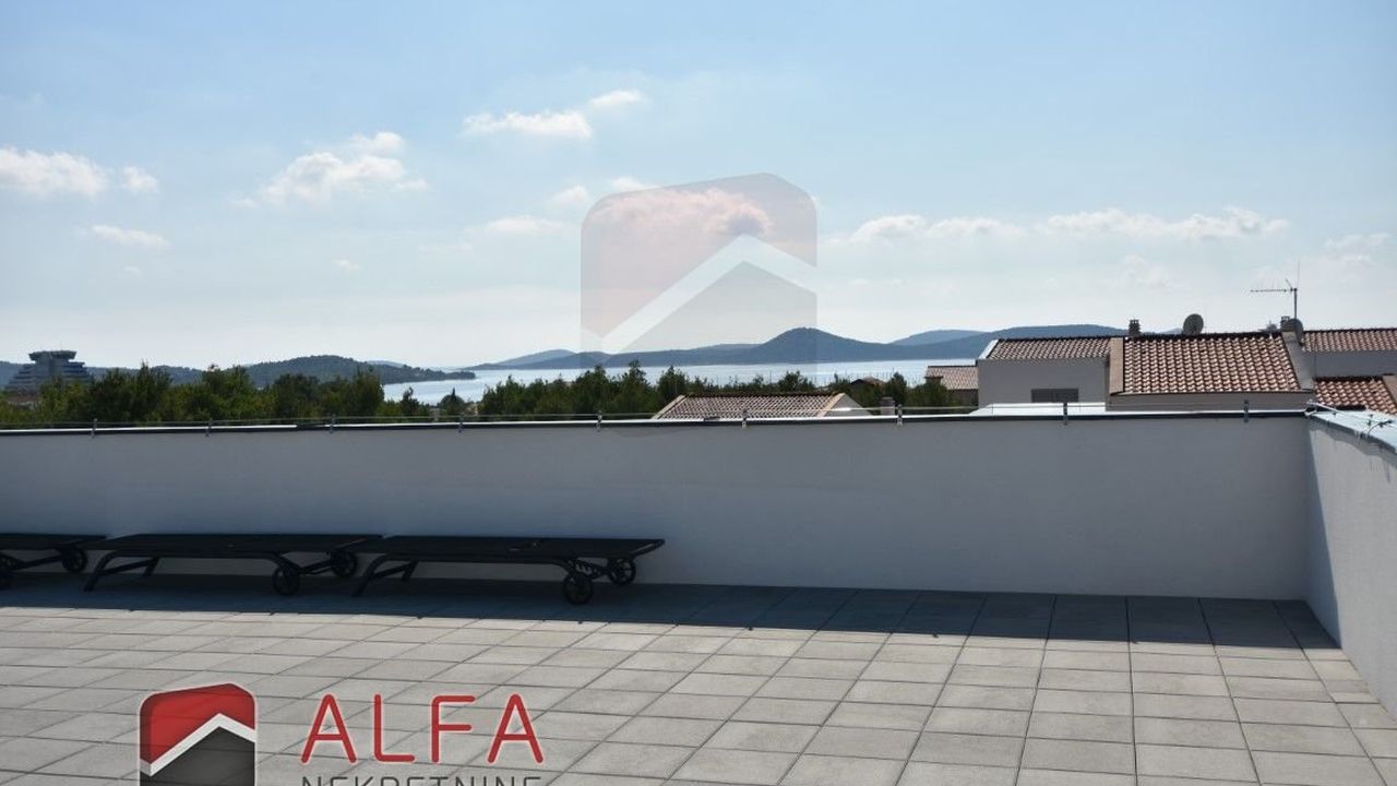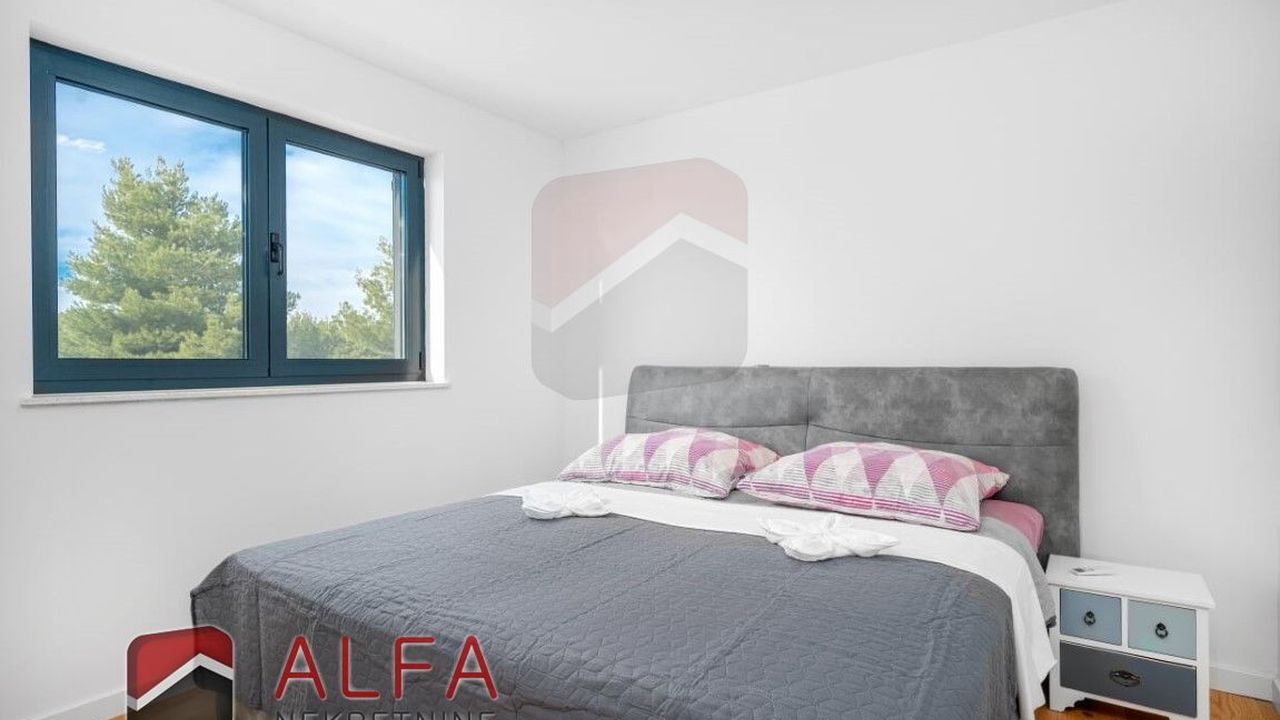 Хорватия, Водице, новая, очень удобная и роскошная отдельностоящая семейная вилла на продажу. Он расположен в тихом месте, в 800 м от моря. Общая площадь дома 240 м2 + терраса на крыше 96 м2, все находится на земельном участке 548 м2. Дом состоит из цокольного этажа, второго этажа и большой террасы на крыше с великолепным панорамным видом на море и город.