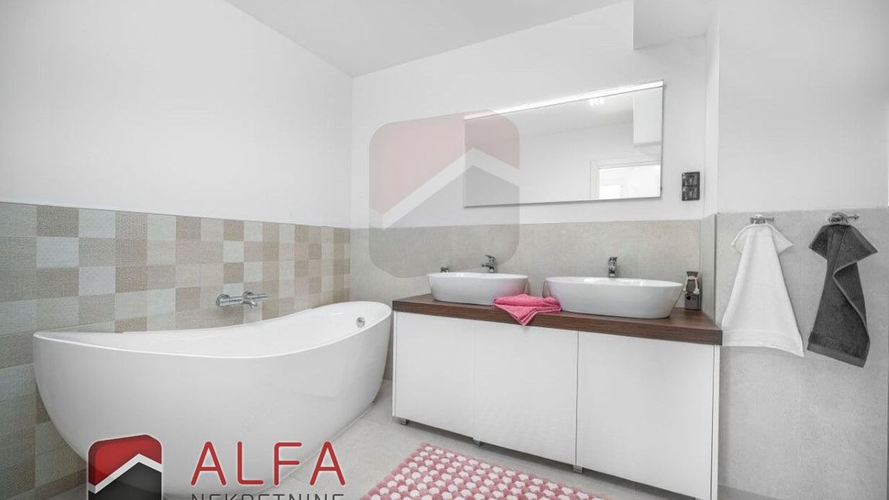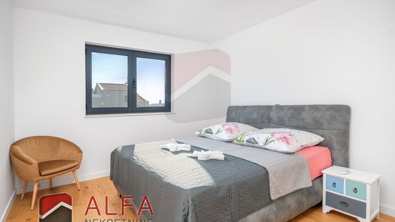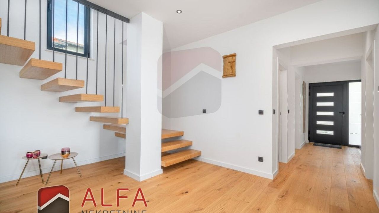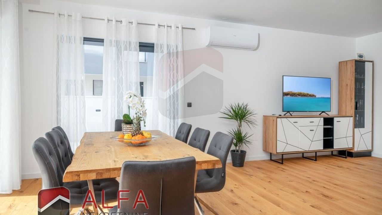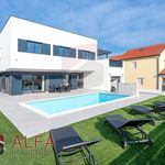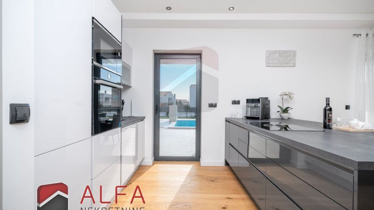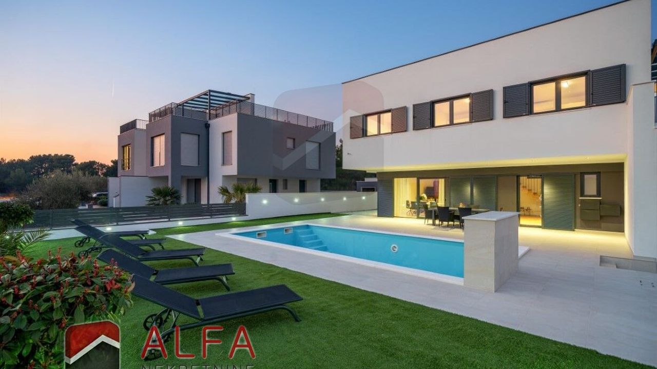 Хорватия, Водице, новая, очень удобная и роскошная отдельностоящая семейная вилла на продажу. Он расположен в тихом месте, в 800 м от моря. Общая площадь дома 240 м2 + терраса на крыше 96 м2, все находится на земельном участке 548 м2. Дом состоит из цокольного этажа, второго этажа и большой террасы на крыше с великолепным панорамным видом на море и город.