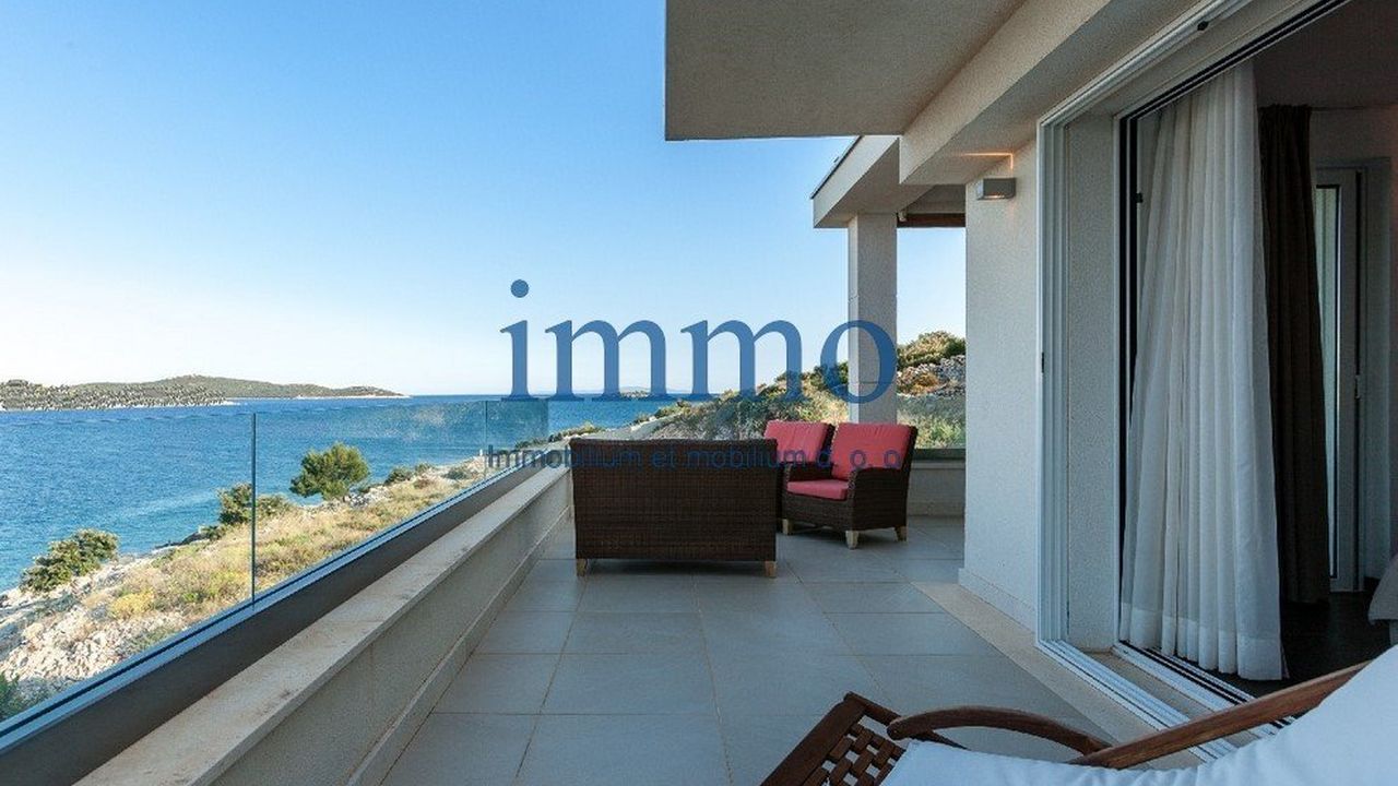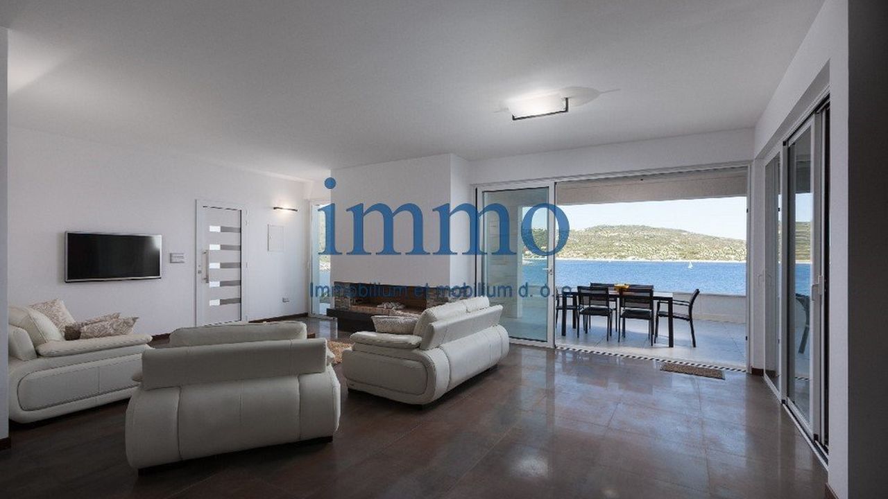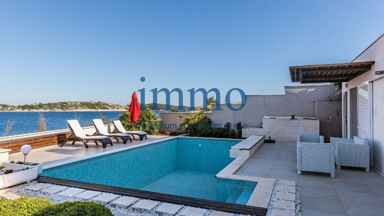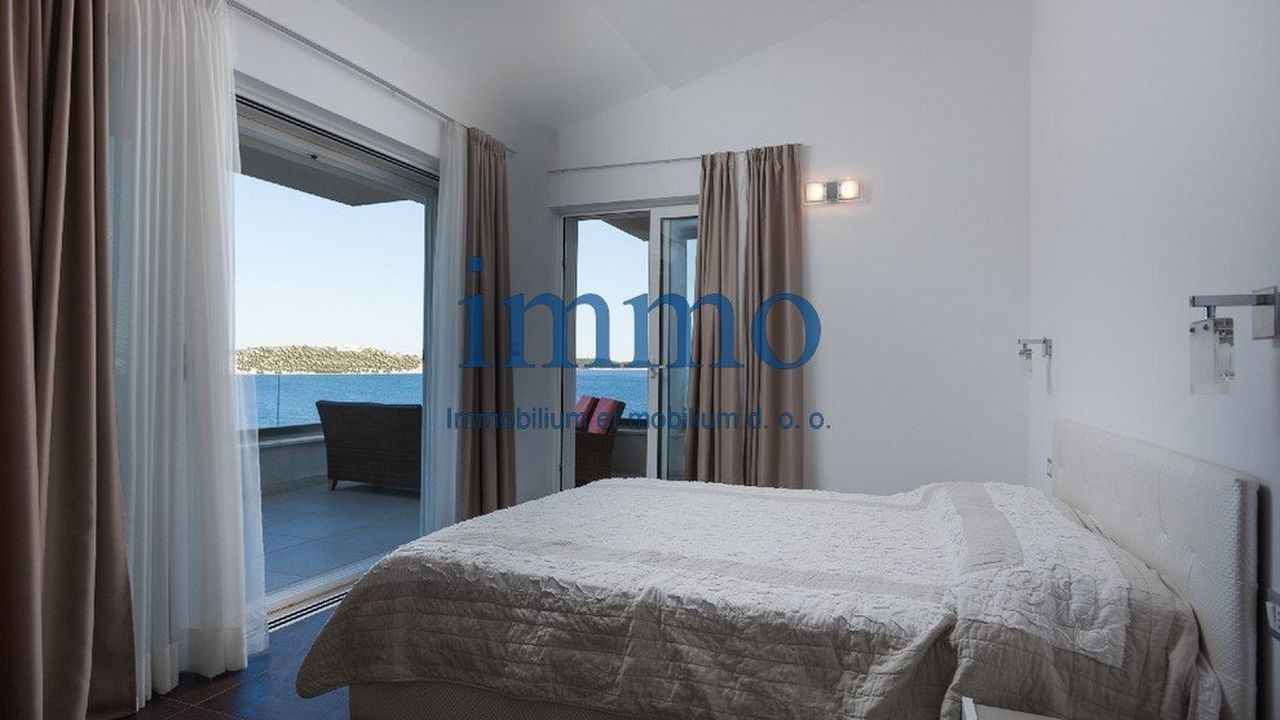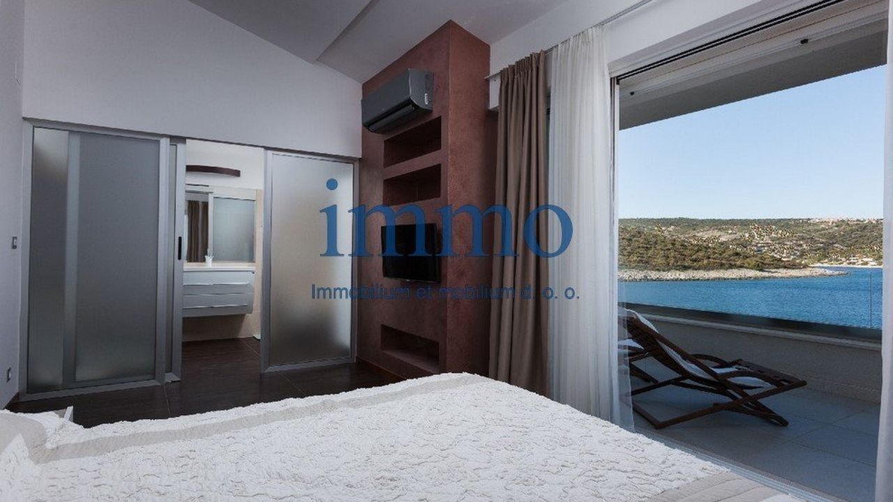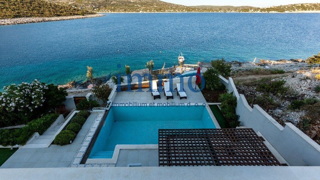 Продается новая роскошная вилла площадью 320 м2, расположенная в красивой бухте недалеко от Рогозницы, в первом ряду от моря. Она расположена на земельном участке площадью 483 м2, занимает три этажа и имеет прекрасный вид на море. Вилла полностью меблирована и оборудована. Нижний этаж состоит из двух отдельных апартаментов с видом на море. Оба апартамента роскошно обставлены и имеют ванную комнату и мини-кухню. На среднем этаже находится кухня со столовой, просторная гостиная с камином, кабинет и ванная комната, а на верхнем этаже расположены три спальни с ванными комнатами и выходом на террасу. Вилла окружена ухоженным участком с бассейном (8x4 м) и просторной террасой с грилем, садом с автоматической системой полива и гаражом (40 м2). Участок окружен оградой из камня, что обеспечивает мир и уединение.