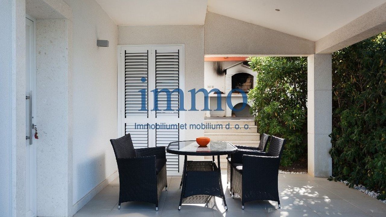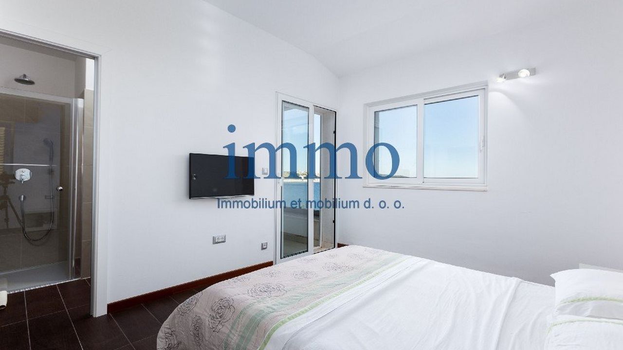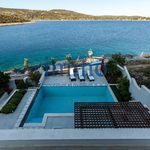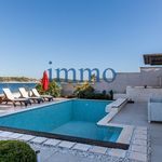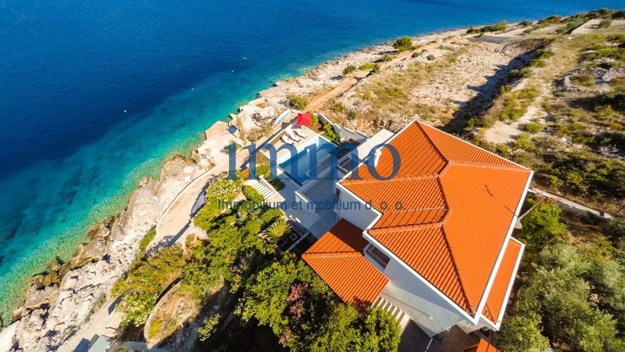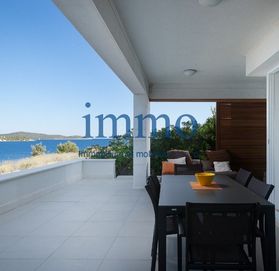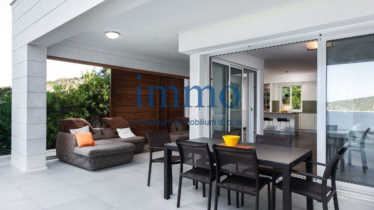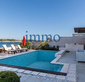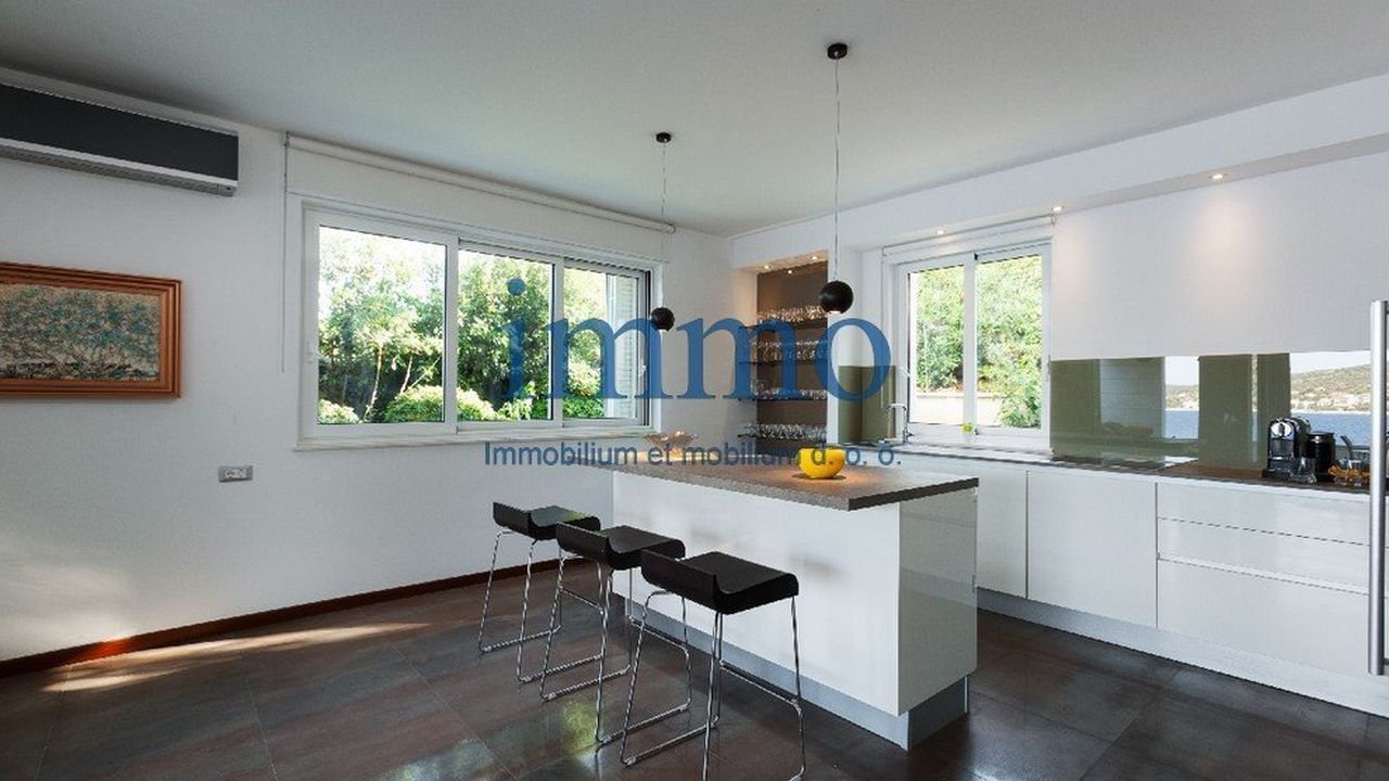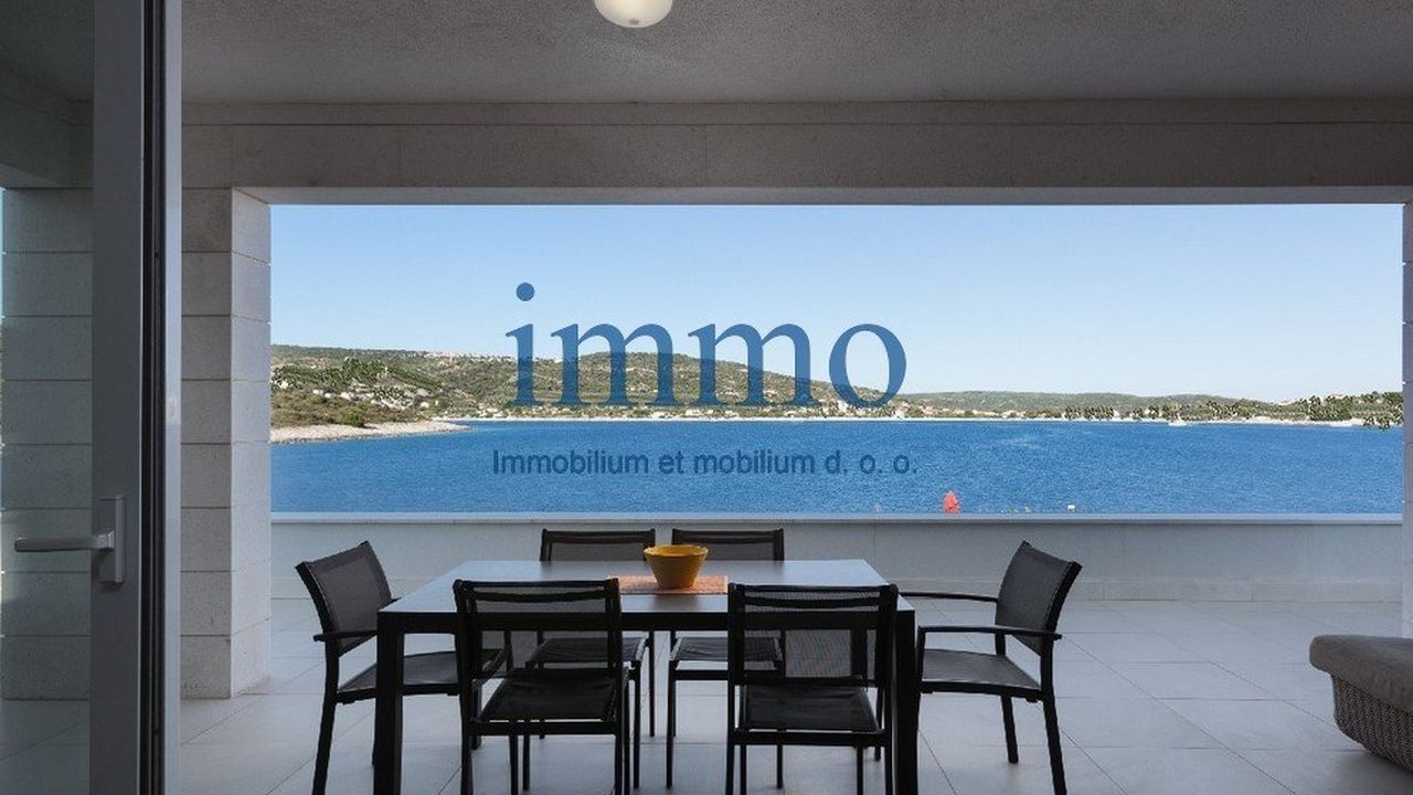 Продается новая роскошная вилла площадью 320 м2, расположенная в красивой бухте недалеко от Рогозницы, в первом ряду от моря. Она расположена на земельном участке площадью 483 м2, занимает три этажа и имеет прекрасный вид на море. Вилла полностью меблирована и оборудована. Нижний этаж состоит из двух отдельных апартаментов с видом на море. Оба апартамента роскошно обставлены и имеют ванную комнату и мини-кухню. На среднем этаже находится кухня со столовой, просторная гостиная с камином, кабинет и ванная комната, а на верхнем этаже расположены три спальни с ванными комнатами и выходом на террасу. Вилла окружена ухоженным участком с бассейном (8x4 м) и просторной террасой с грилем, садом с автоматической системой полива и гаражом (40 м2). Участок окружен оградой из камня, что обеспечивает мир и уединение.