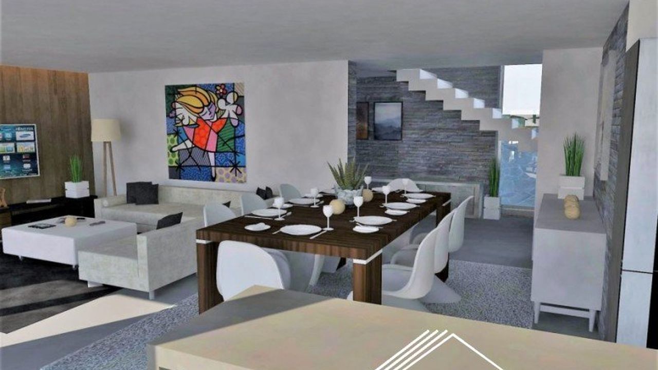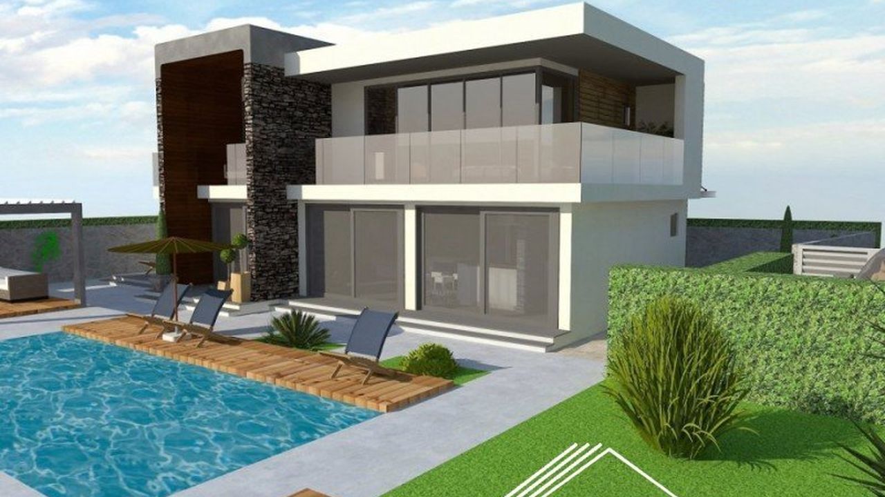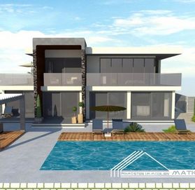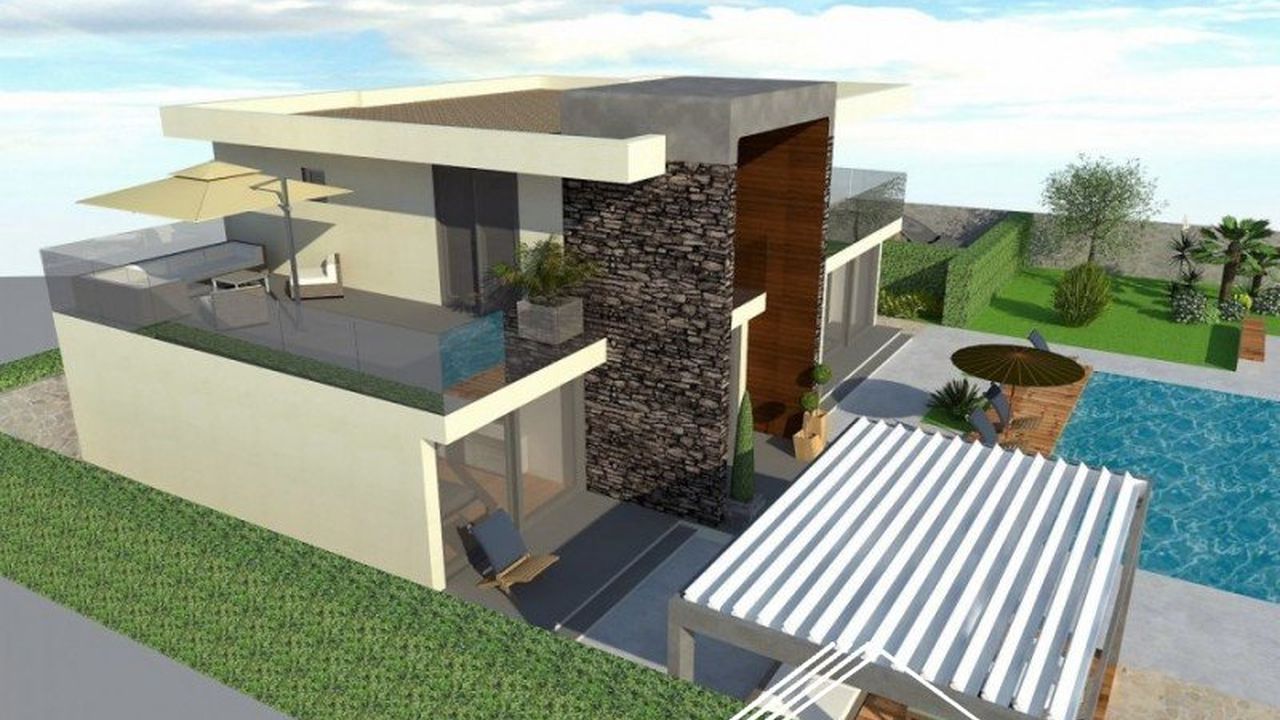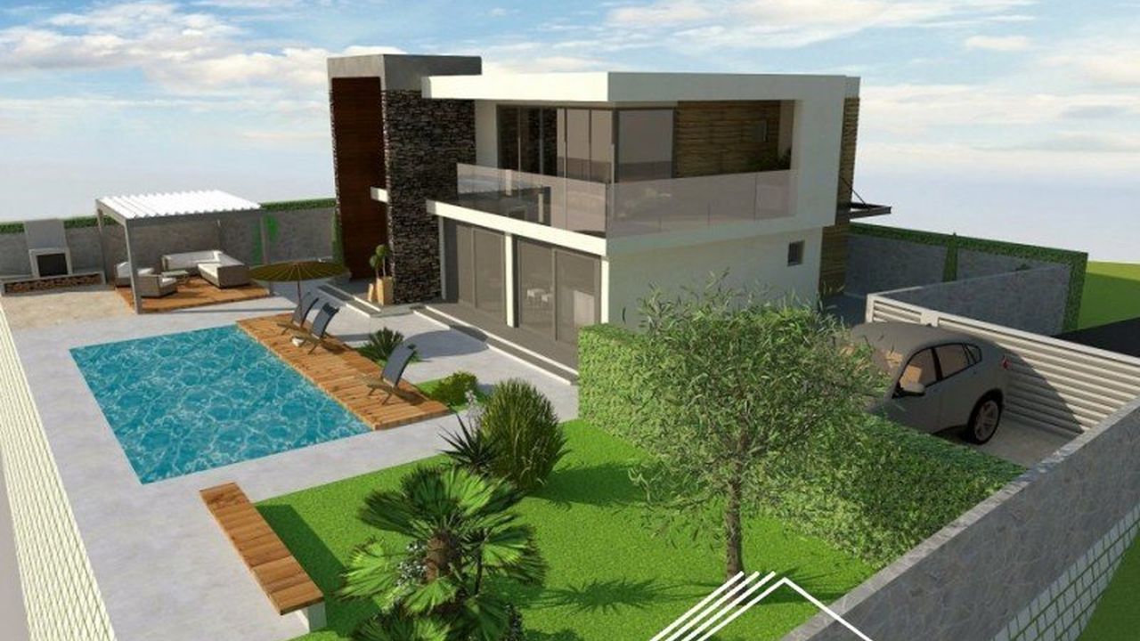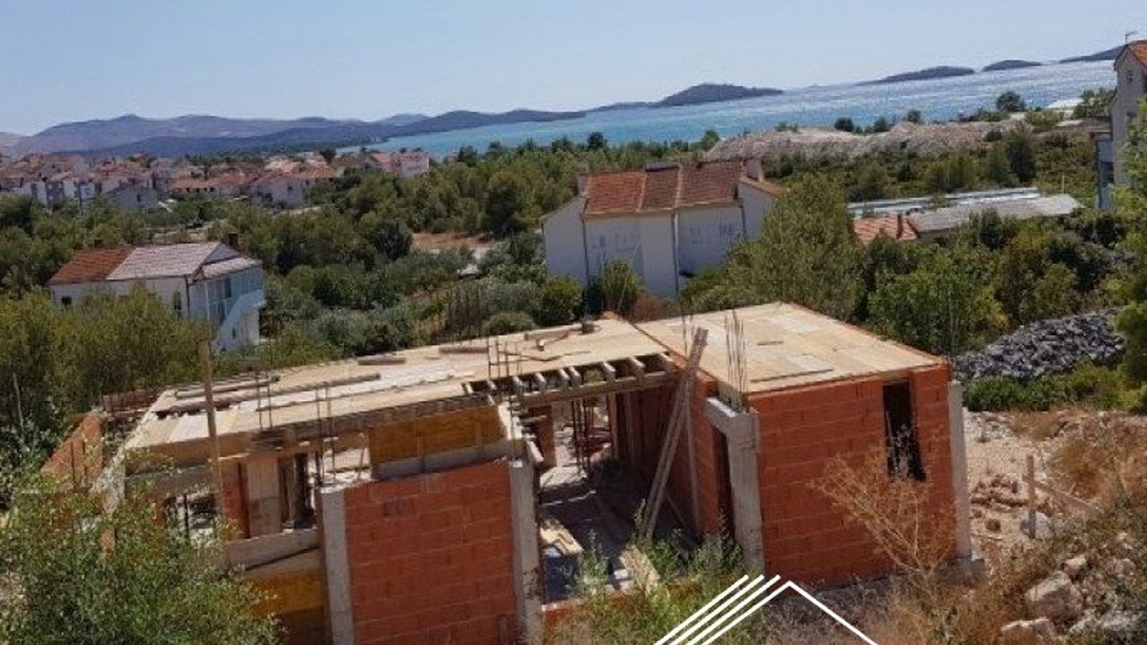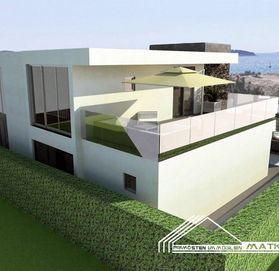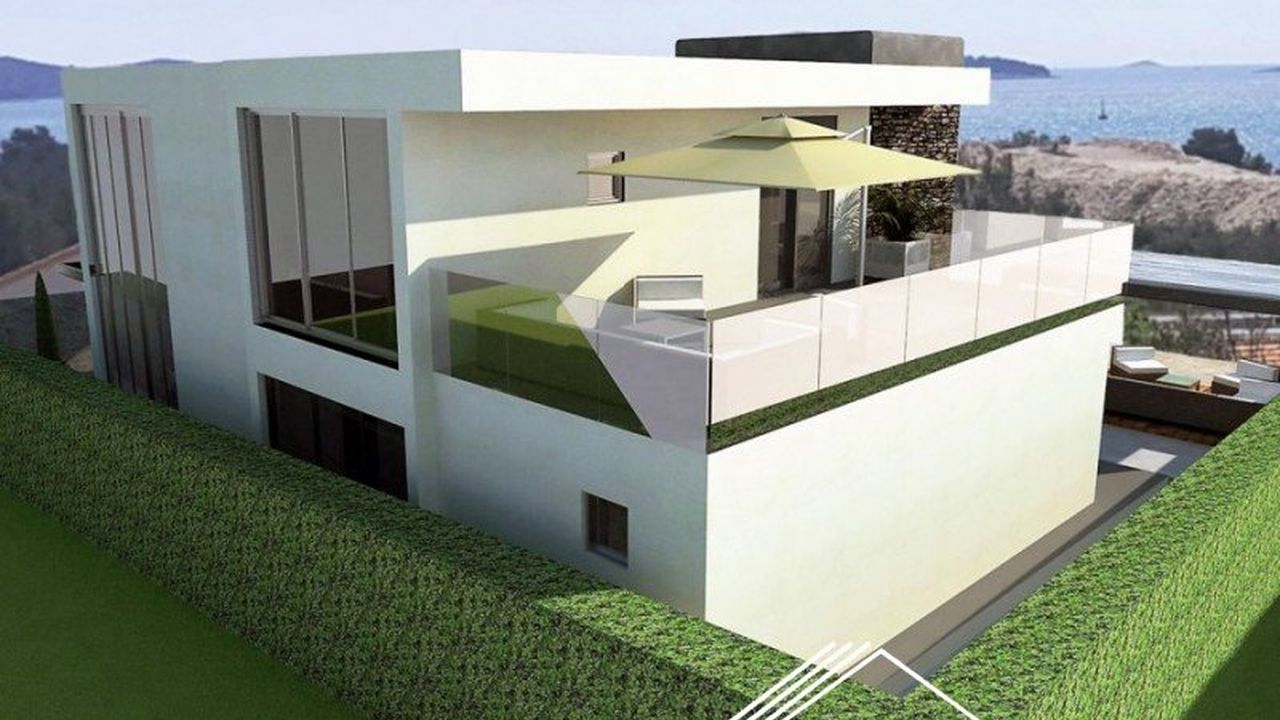 This construction project with plot for a beautiful and modern villa with swimming pool in Šibenik, has a total area of 220 m2 and covers a plot area of 515 m2. It consists of ground floor and upper floor. On the ground floor is a living-kitchen area, a spacious living room, bedroom with walk-in wardrobe, a storage room, separate toilet and a bathroom. On the terrace there is a swimming pool with 32m2. On the upper floor of the villa are 2 bedrooms, each with its own bathroom and walk-in closet and 2 terraces (50m2 in total) with a wonderful view to the sea. Because of the elevated slope of the property, a beautiful and unobstructable view of the coastal landscape. The Adriatic Sea and surrounding places. The distance from the sea is about 450 m. The completion of the construction project is planned for 12/2017. Trogir airport is 45 km away.