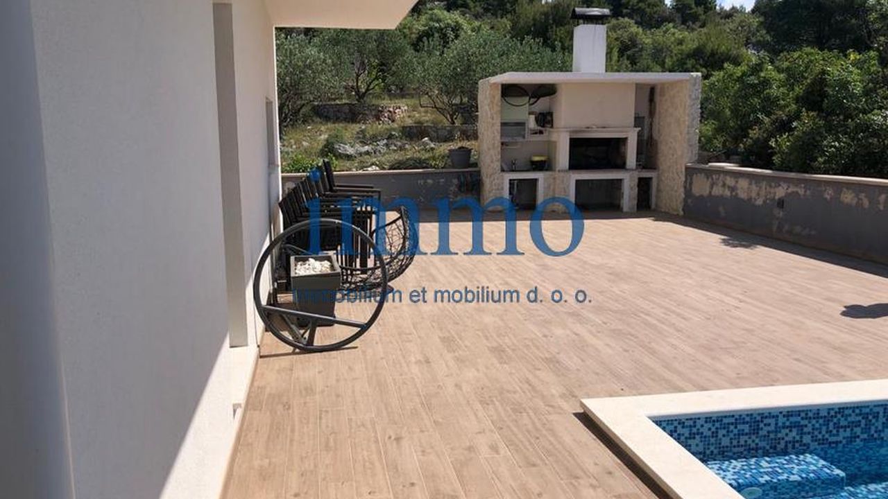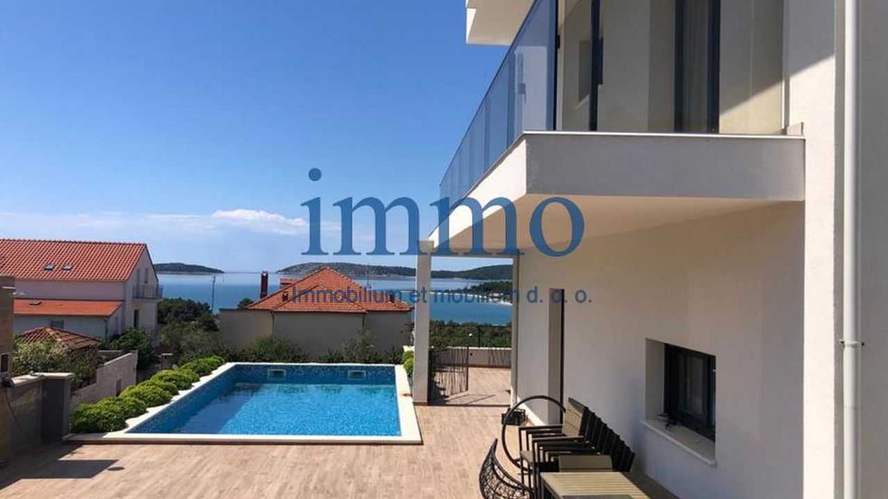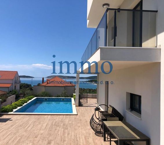 Продается прекрасный новый дом, расположенный в пригороде Шибеника в 200 м от моря и пляжа. Дом имеет площадь 350 м2, расположен на участке 530 м2, имеет три этажа и располагает красивыми видами на море и окрестности. Первый и второй этажи занимает двухэтажный апартамент. На нижнем уровне расположены гостиная открытой планировки с кухней и столовой, ванная комната, кабинет. Гостиная имеет прямой выход на просторную террасу с бассейном. На верхнем уровне находятся главная спальня с гардеробом и ванной комнатой, две спальни, ванная комната и прачечная. Все комнаты имею балкон с видом на море. На третьем этаже находятся два апартамента для гостей с отдельными входами. Каждый апартамент состоит из гостиной, кухни, спальни и ванной комнаты. Из гостиной есть выход на балкон с прекрасным видом на море и окрестности. Дом окружен ухоженным участком со средиземноморскими растениями, террасами, бассейном, внешним грилем и гаражом 25 м2. На участке рядом с домом также есть паркинг для нескольких автомобилей.