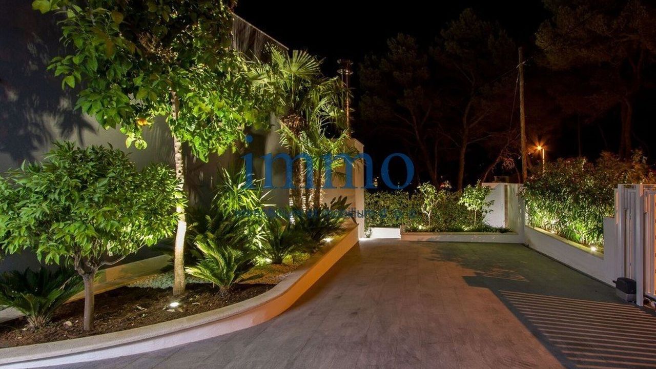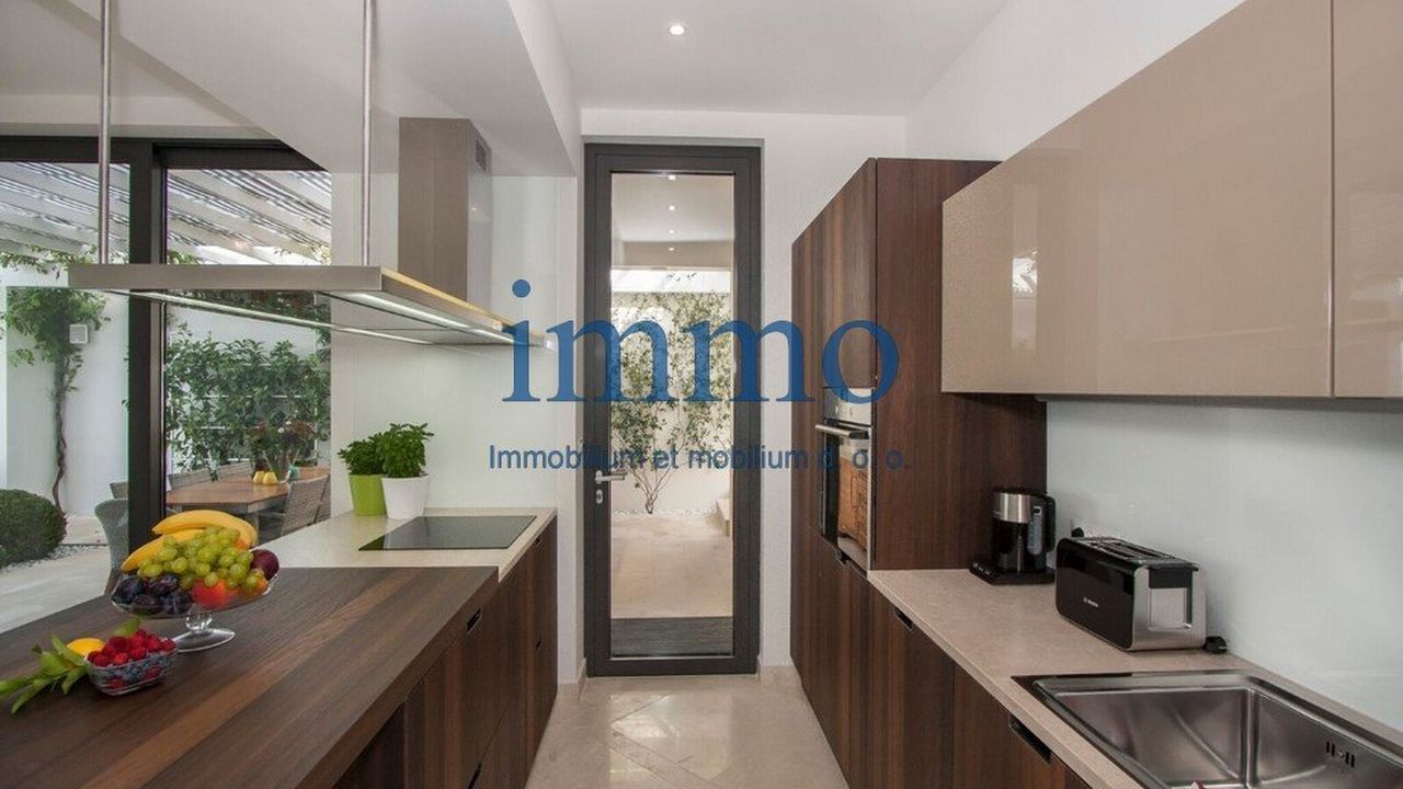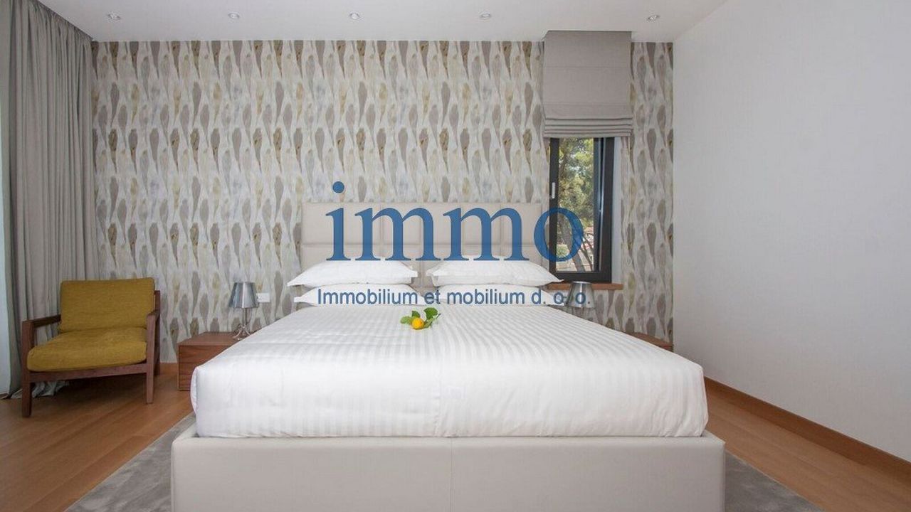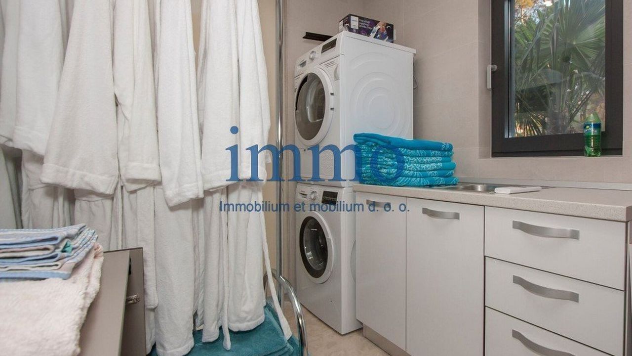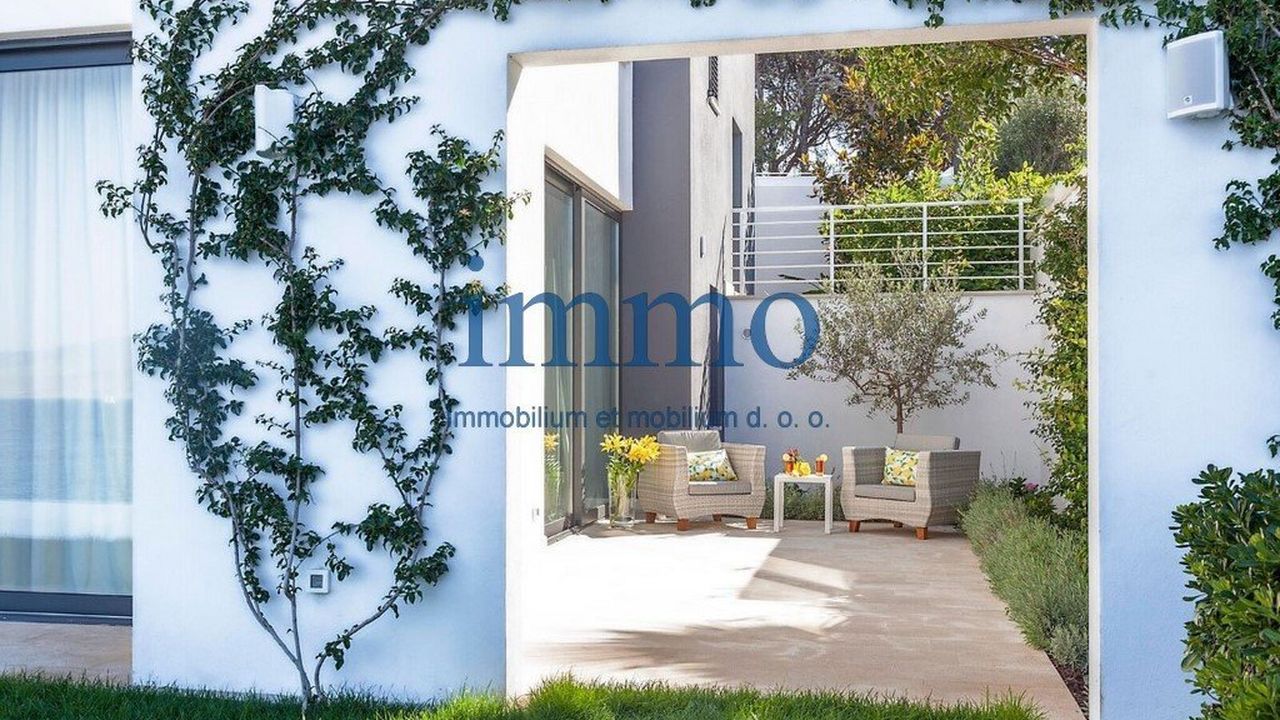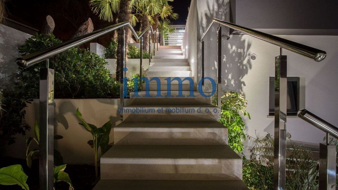 В цокольном этаже находятся тренажерный зал, сауна, кладовая и туалет. Первый этаж состоит из гостиной, кухни со столовой, спальни с ванной комнатой и гостевого туалета. Гостиная имеет выход на просторную террасу с бассейном, летней кухней, открытым камином и обеденной зоной. На втором находятся две спальни с ванными комнатами. Обе комнаты имеют балкон с прекрасным видом на море. Вилла полностью меблирована и роскошно оборудована. Двор красиво оформлен и ухожен имеет сад, душ на открытом воздухе и паркинг для трех автомобилей.