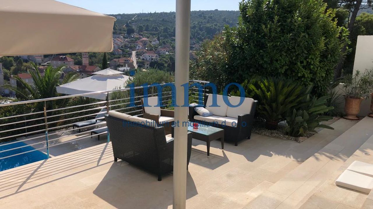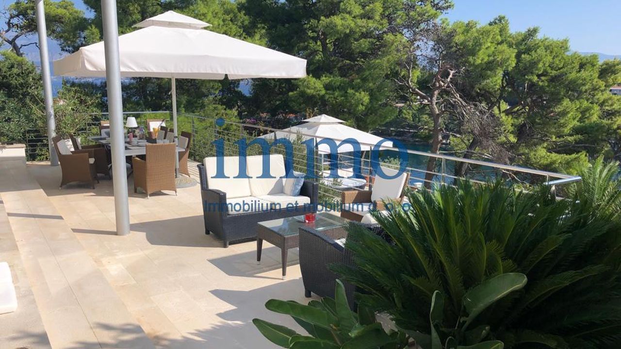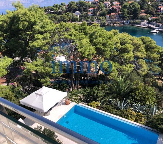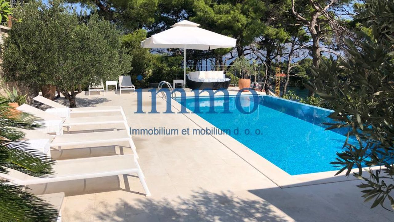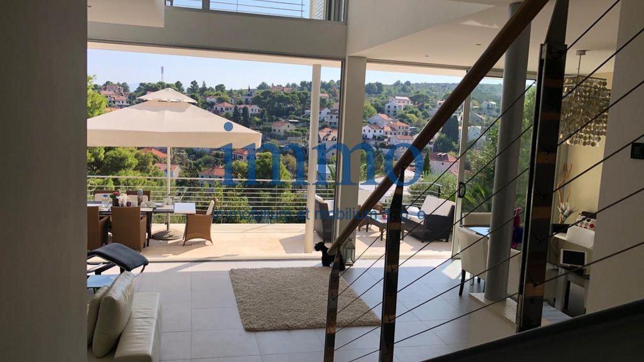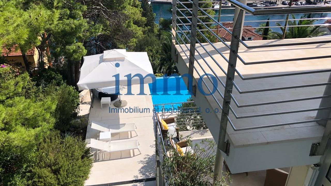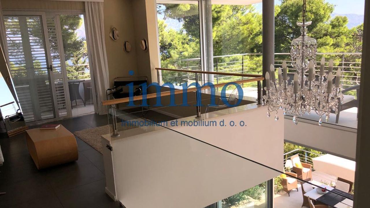 Продается роскошная трехэтажная вилла, расположенная возле моря в небольшом приморском городке на северной стороне острова Брач. Вилла находится на возвышении в 50 м от моря и располагает захватывающим открытым видом на море и поселок. Вилла была построена в 2006 году, а в 2019 году был полностью обновлен фасад здания. Главный вход в виллу находится на среднем этаже, который состоит из прихожей, гардероба, небольшой гостиной, главной спальни с гардеробом, большой ванной комнаты и выходом на крытую террасу и еще одной спальни с гардеробом, ванной комнатой и террасой. На нижнем этаже расположены гараж для двух автомобилей, просторная гостиная открытого типа с кухней и столовой, туалет и апартамент для гостей, состоящий из гостиной, спальни и ванной комнаты. Гостевой апартамент имеет вход как изнутри, так и снаружи здания. Гостиная имеет стеклянные раздвижные стены с выходом на прекрасную террасу с видом на море, под которой находится небольшое помещение (ок. 7 м2) с тренажерами и туалетом на, а со стороны кухни есть еще одна небольшая терраса с грилем. Кухня также имеет и техническое помещение (кладовая/прачечная). Верхний этаж состоит из прихожей с выходом на просторную (ок. 40 м2), частично крытую террасу, детской, спальни с двумя балконами, еще одной спальни с выходом на террасу и ванной комнаты.