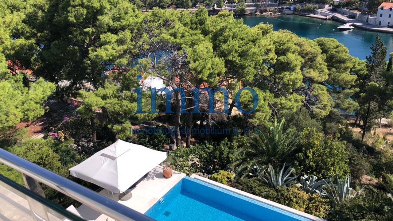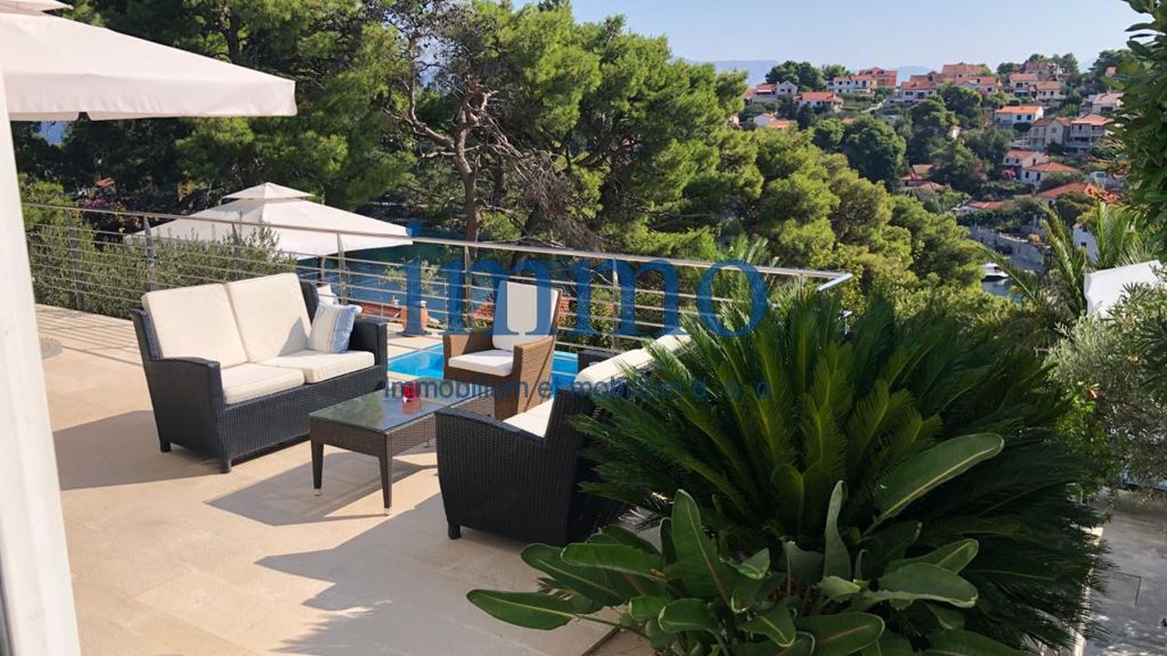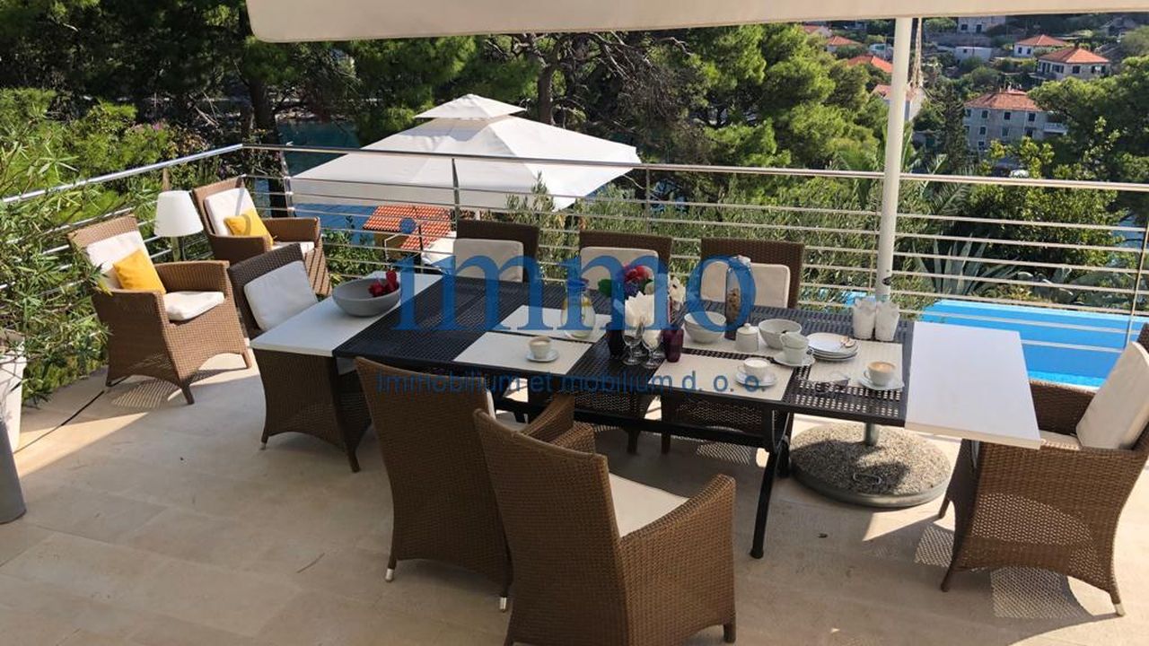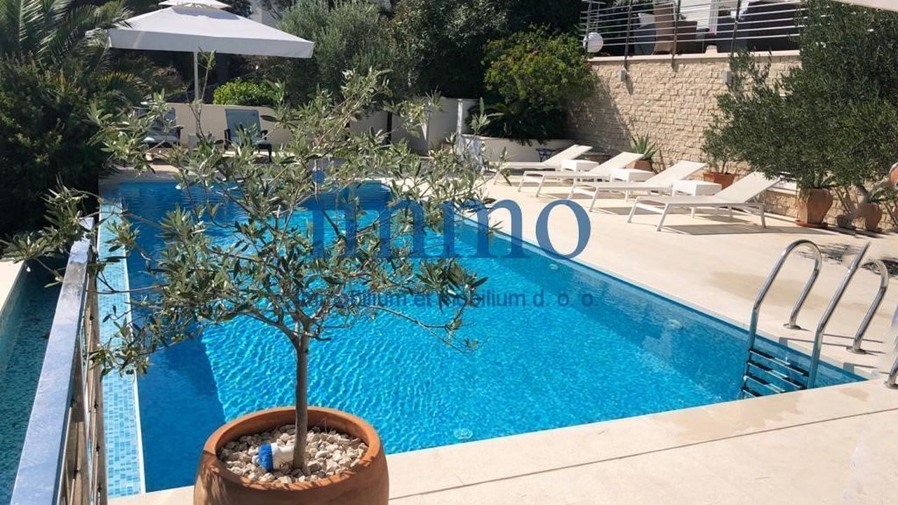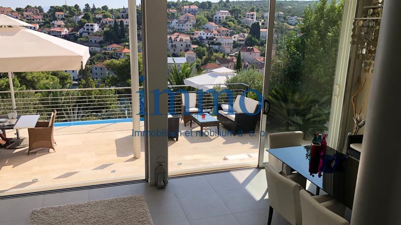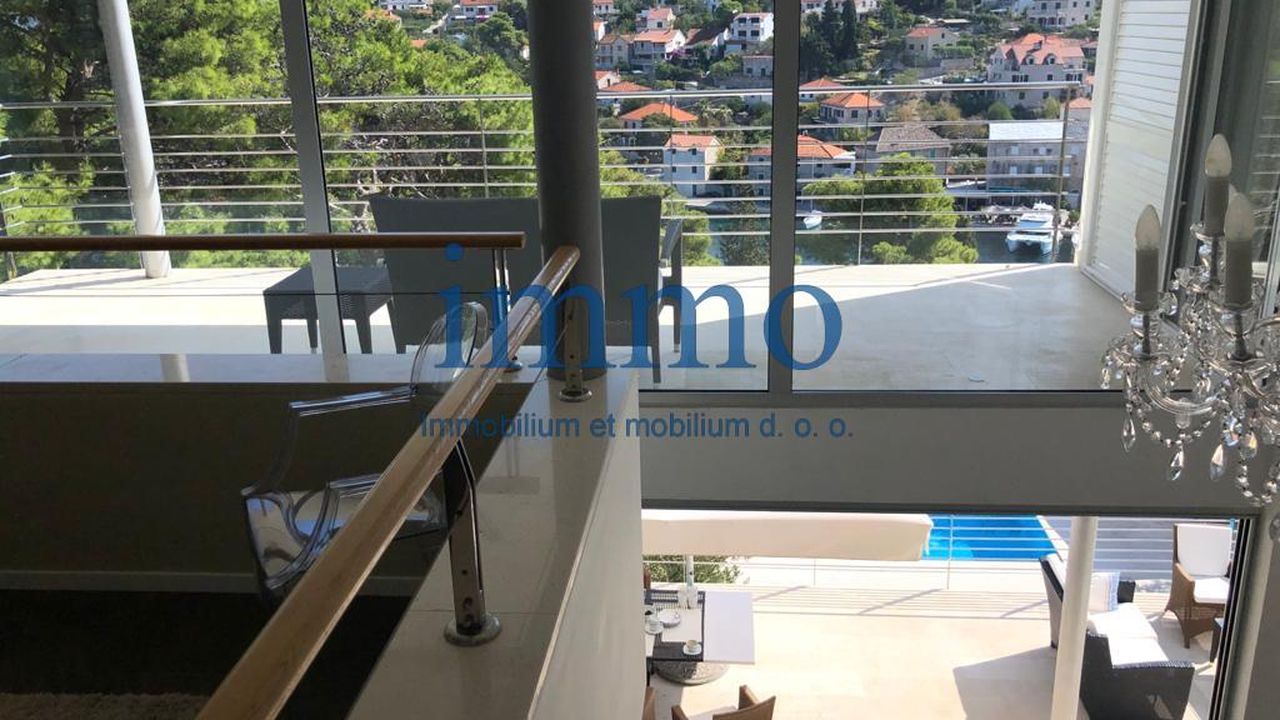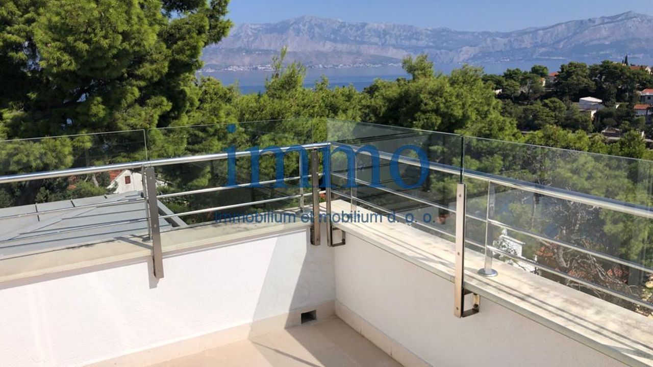 Продается роскошная трехэтажная вилла, расположенная возле моря в небольшом приморском городке на северной стороне острова Брач. Вилла находится на возвышении в 50 м от моря и располагает захватывающим открытым видом на море и поселок. Вилла была построена в 2006 году, а в 2019 году был полностью обновлен фасад здания. Главный вход в виллу находится на среднем этаже, который состоит из прихожей, гардероба, небольшой гостиной, главной спальни с гардеробом, большой ванной комнаты и выходом на крытую террасу и еще одной спальни с гардеробом, ванной комнатой и террасой. На нижнем этаже расположены гараж для двух автомобилей, просторная гостиная открытого типа с кухней и столовой, туалет и апартамент для гостей, состоящий из гостиной, спальни и ванной комнаты. Гостевой апартамент имеет вход как изнутри, так и снаружи здания. Гостиная имеет стеклянные раздвижные стены с выходом на прекрасную террасу с видом на море, под которой находится небольшое помещение (ок. 7 м2) с тренажерами и туалетом на, а со стороны кухни есть еще одна небольшая терраса с грилем. Кухня также имеет и техническое помещение (кладовая/прачечная). Верхний этаж состоит из прихожей с выходом на просторную (ок. 40 м2), частично крытую террасу, детской, спальни с двумя балконами, еще одной спальни с выходом на террасу и ванной комнаты.