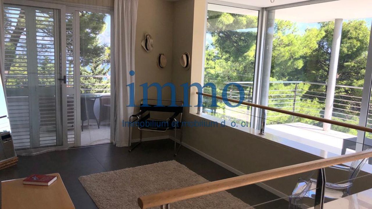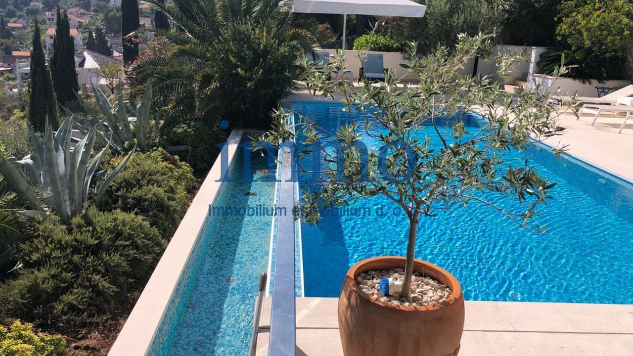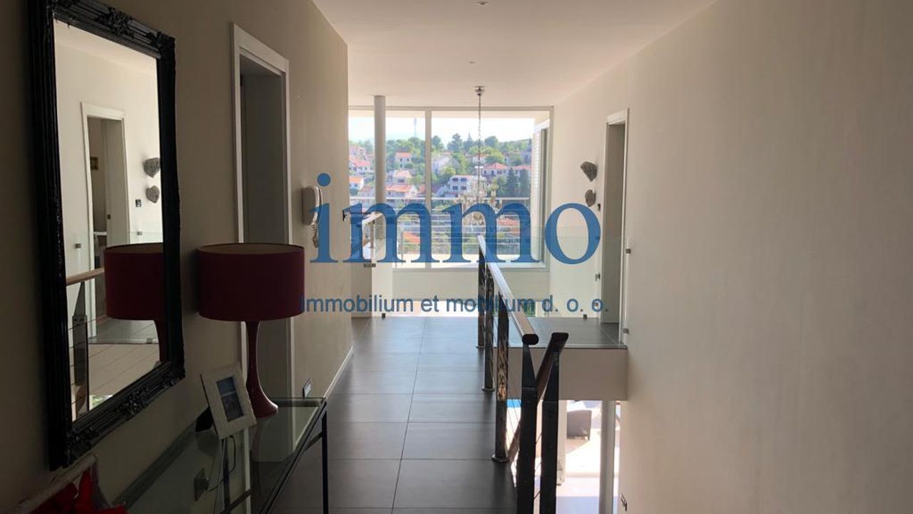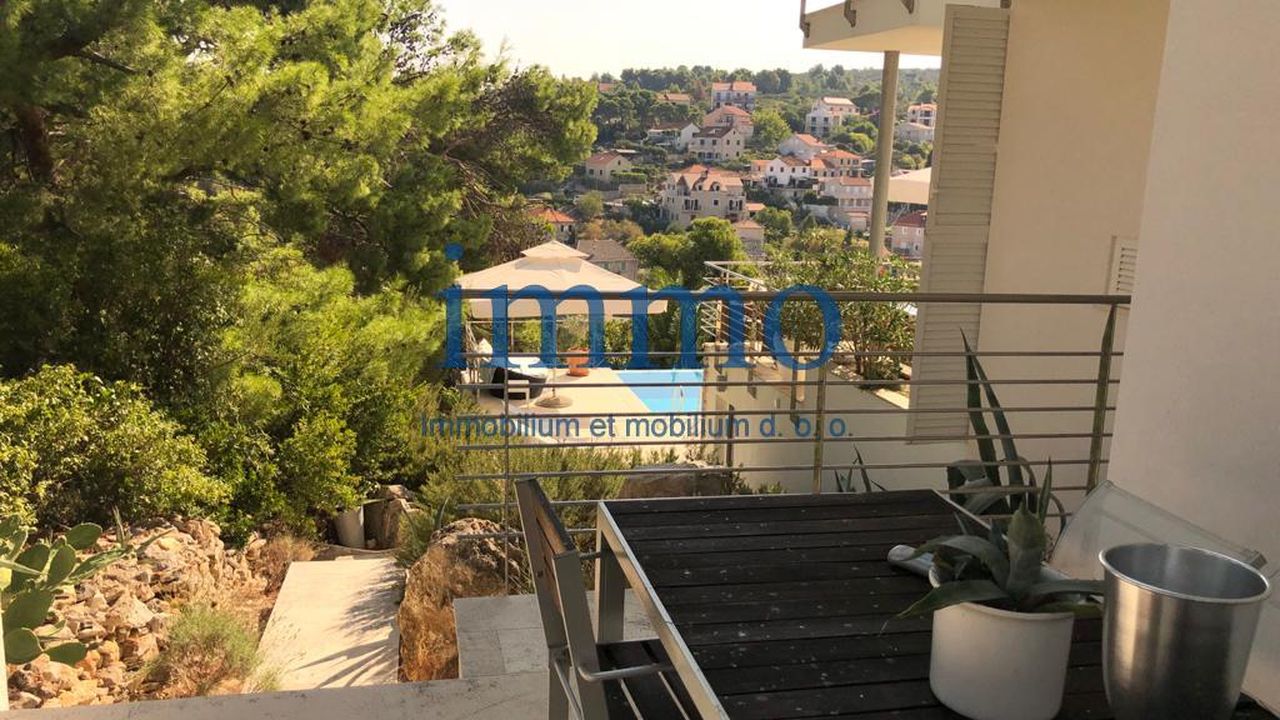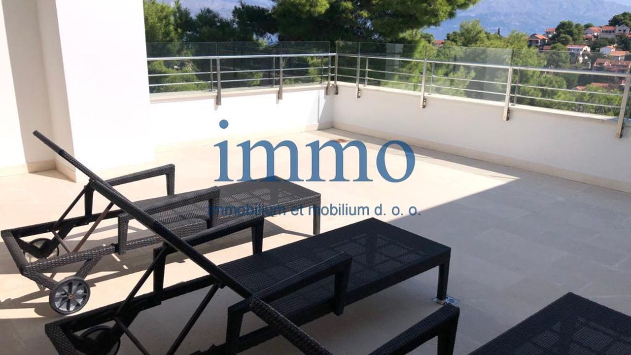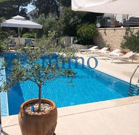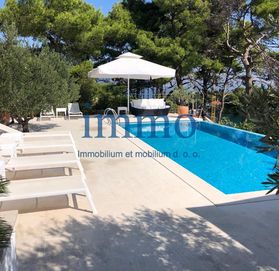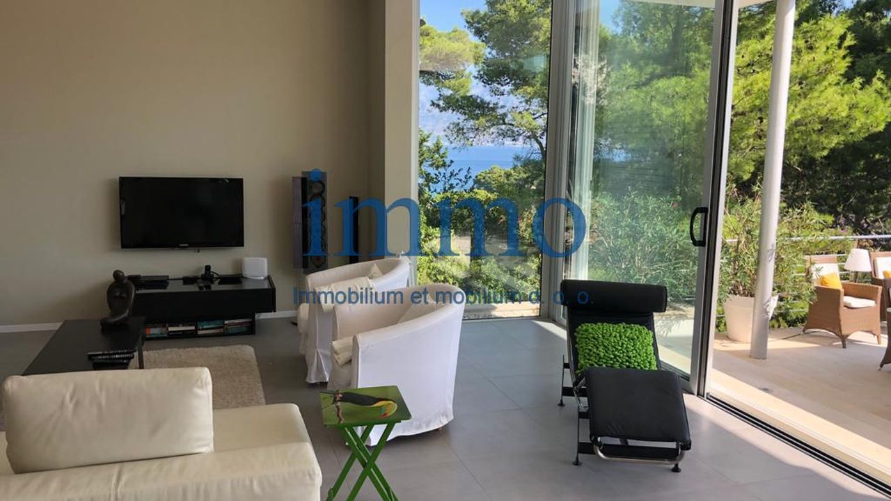 Продается роскошная трехэтажная вилла, расположенная возле моря в небольшом приморском городке на северной стороне острова Брач. Вилла находится на возвышении в 50 м от моря и располагает захватывающим открытым видом на море и поселок. Вилла была построена в 2006 году, а в 2019 году был полностью обновлен фасад здания. Главный вход в виллу находится на среднем этаже, который состоит из прихожей, гардероба, небольшой гостиной, главной спальни с гардеробом, большой ванной комнаты и выходом на крытую террасу и еще одной спальни с гардеробом, ванной комнатой и террасой. На нижнем этаже расположены гараж для двух автомобилей, просторная гостиная открытого типа с кухней и столовой, туалет и апартамент для гостей, состоящий из гостиной, спальни и ванной комнаты. Гостевой апартамент имеет вход как изнутри, так и снаружи здания. Гостиная имеет стеклянные раздвижные стены с выходом на прекрасную террасу с видом на море, под которой находится небольшое помещение (ок. 7 м2) с тренажерами и туалетом на, а со стороны кухни есть еще одна небольшая терраса с грилем. Кухня также имеет и техническое помещение (кладовая/прачечная). Верхний этаж состоит из прихожей с выходом на просторную (ок. 40 м2), частично крытую террасу, детской, спальни с двумя балконами, еще одной спальни с выходом на террасу и ванной комнаты.