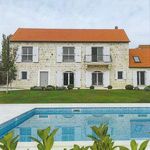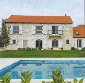 On the ground floor there is a living room, dining room, kitchen, study and pantry, and on the first floor there are three bedrooms, each with bathroom. In front of the house is a swimming pool.
