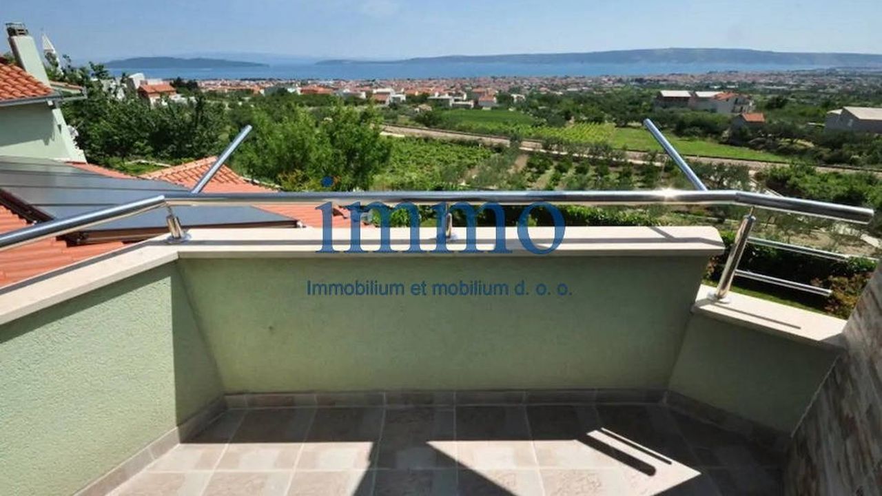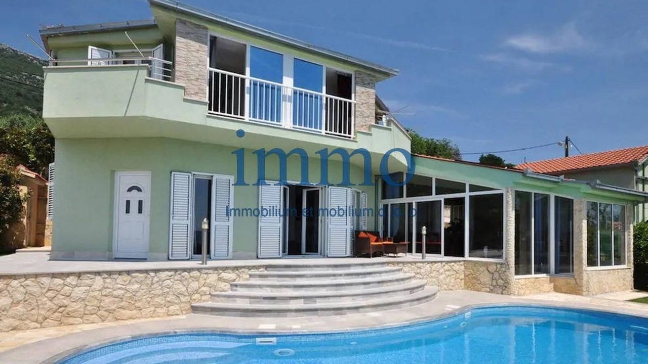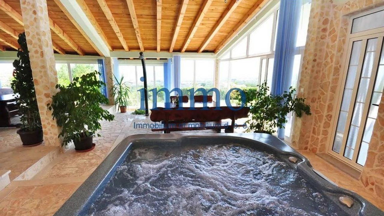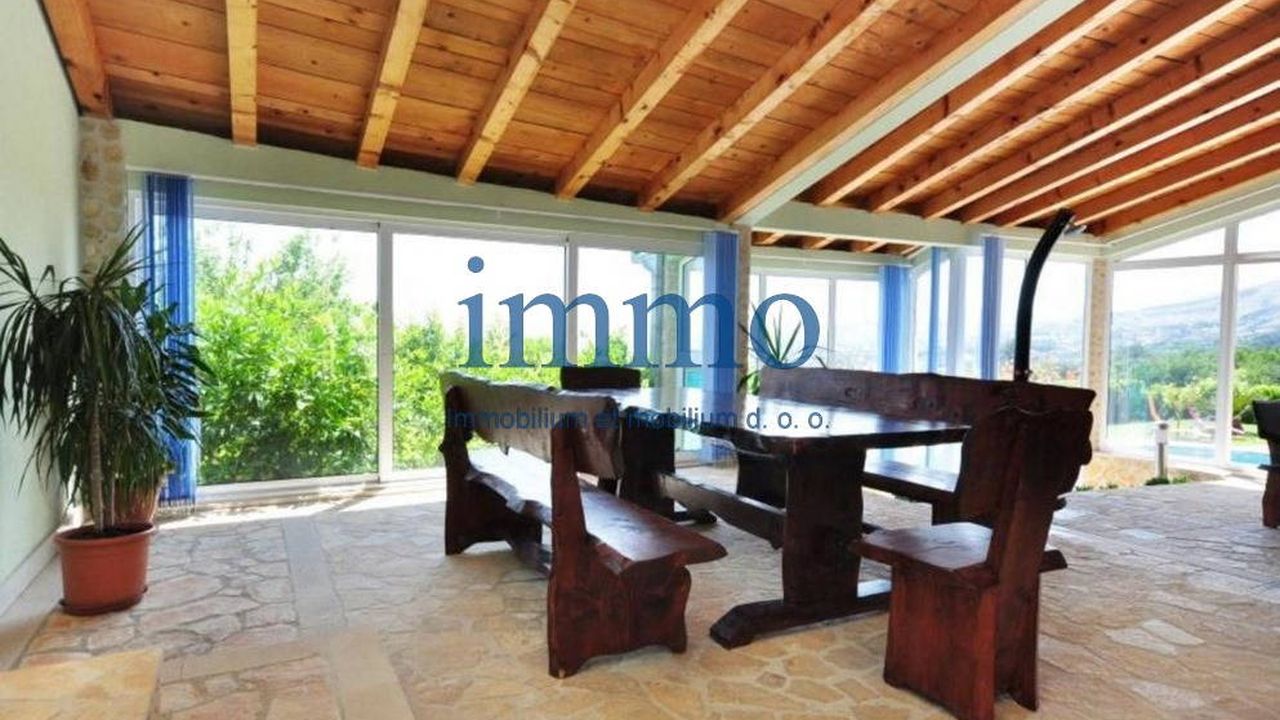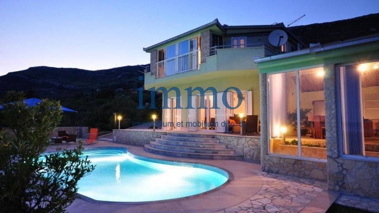 Продается красивая вилла 400 м2, расположенная на участке 3800 м2 в тихом месте в Каштела. Вилла расположена на холме и предлагает фантастические панорамные виды. Вилла состоит из двух частей, соединенных между собой галереей с зимним садом площадью 100 м2. Первая часть виллы площадью 130 м2 занимает два этажа. Первый этаж состоит из просторной гостиной, столовой, кухни и ванной комнаты. Гостиная выходит на террасу с бассейном 40 м2. На втором этаже находятся две спальни, две ванные комнаты и балконы. Вторая часть виллы площадью 150 м2 состоит из двух этажей. На первом этаже находятся спальня с ванной комнатой, гостевая ванная комната, гостиная, кухня и терраса, а наверху две спальни, ванная комната и балконы. Вилла полностью меблирована и хорошо оборудована и окружена участком с барбекю, оливковой рощей, садом и паркингом.