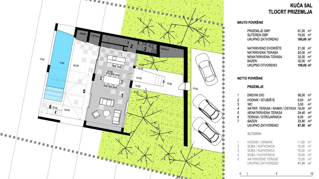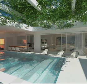 Нижний уровень предлагает большой салон с зонами гостиной, столовой, кухни, гостевым санузлом, кладовыми помещениями и просторной террасой, где разместились зона барбекю, летняя кухня, летняя столовая зона и бассейн.