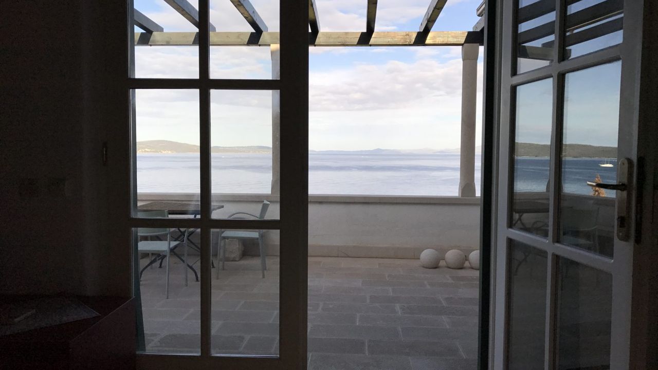 Нижний уровень: каминный зал, столовая с кухней, санузел для гостей, терраса с видом на море, спальня, ванная комната.
