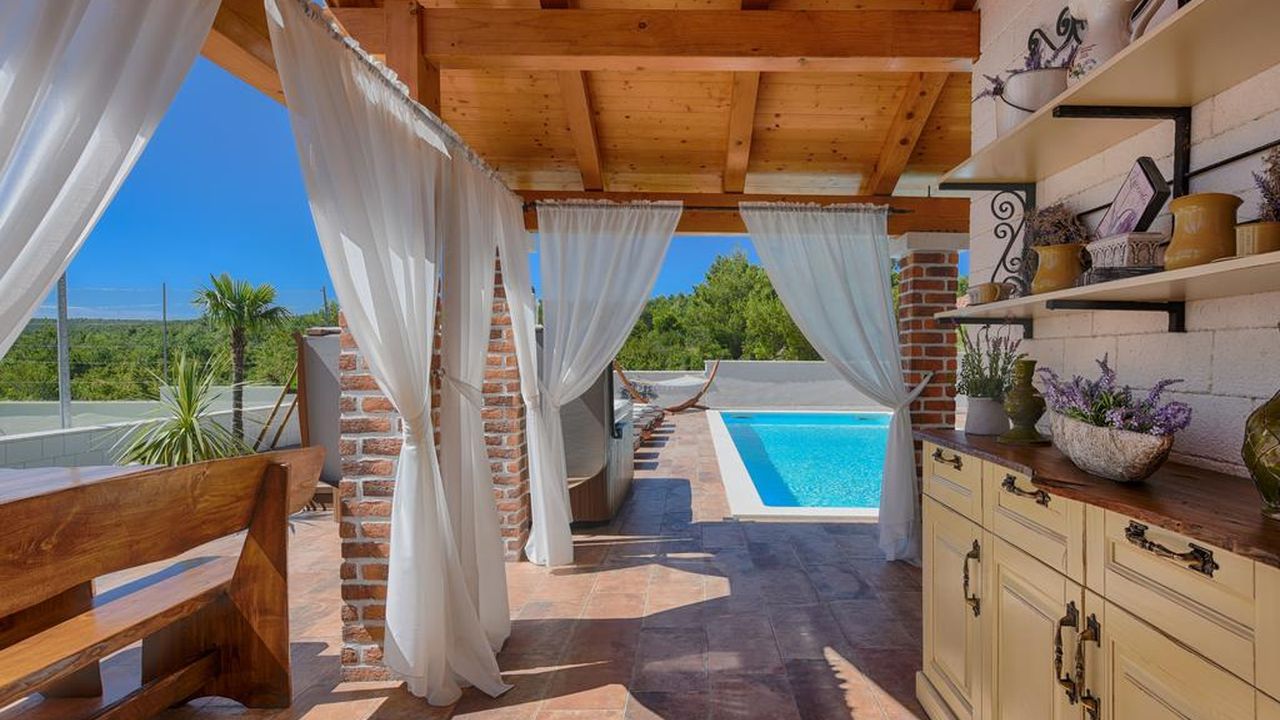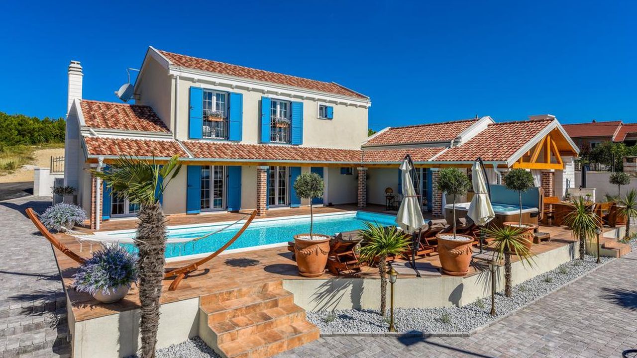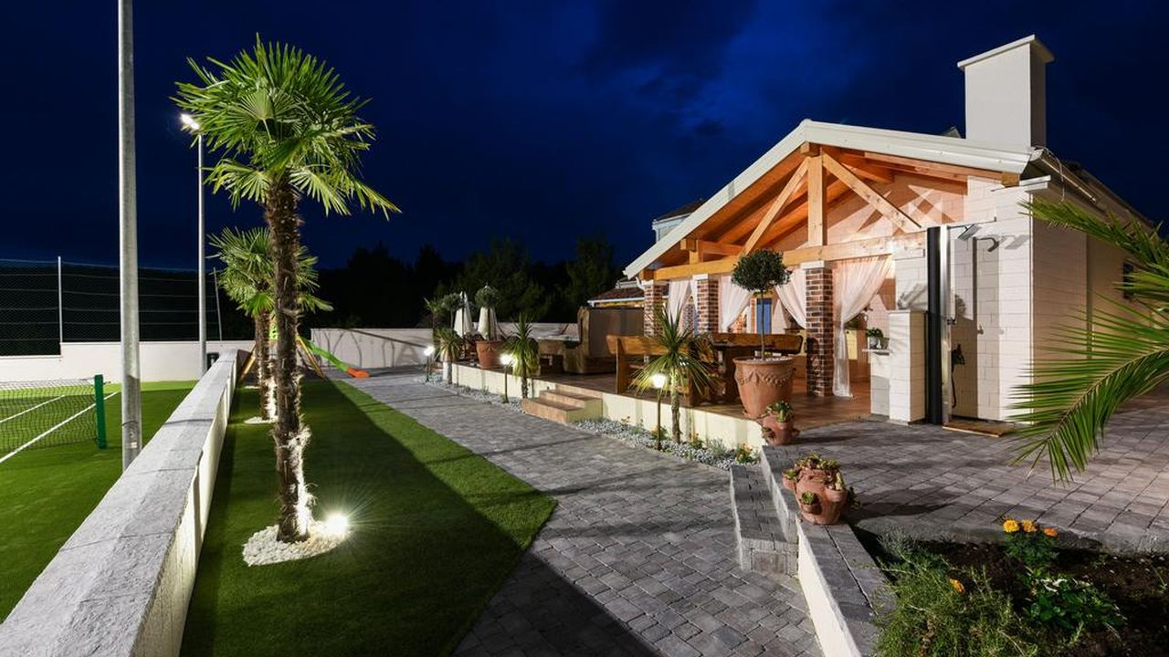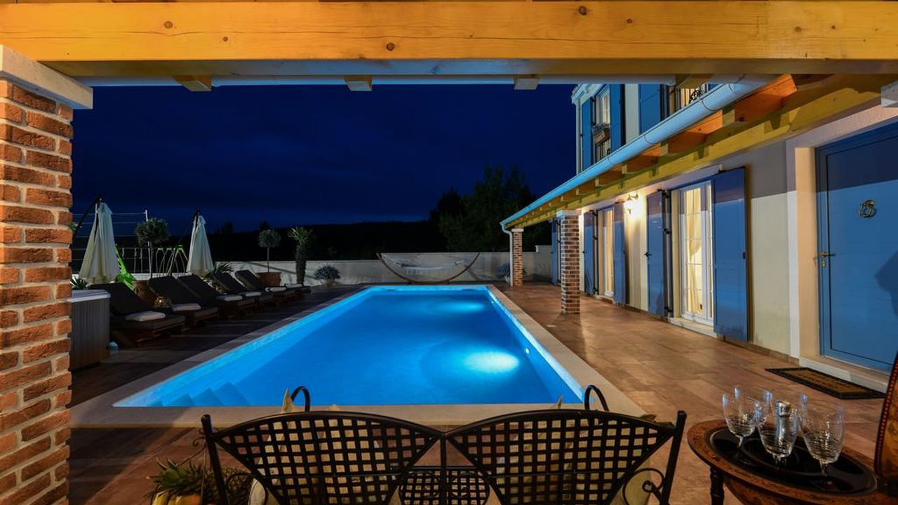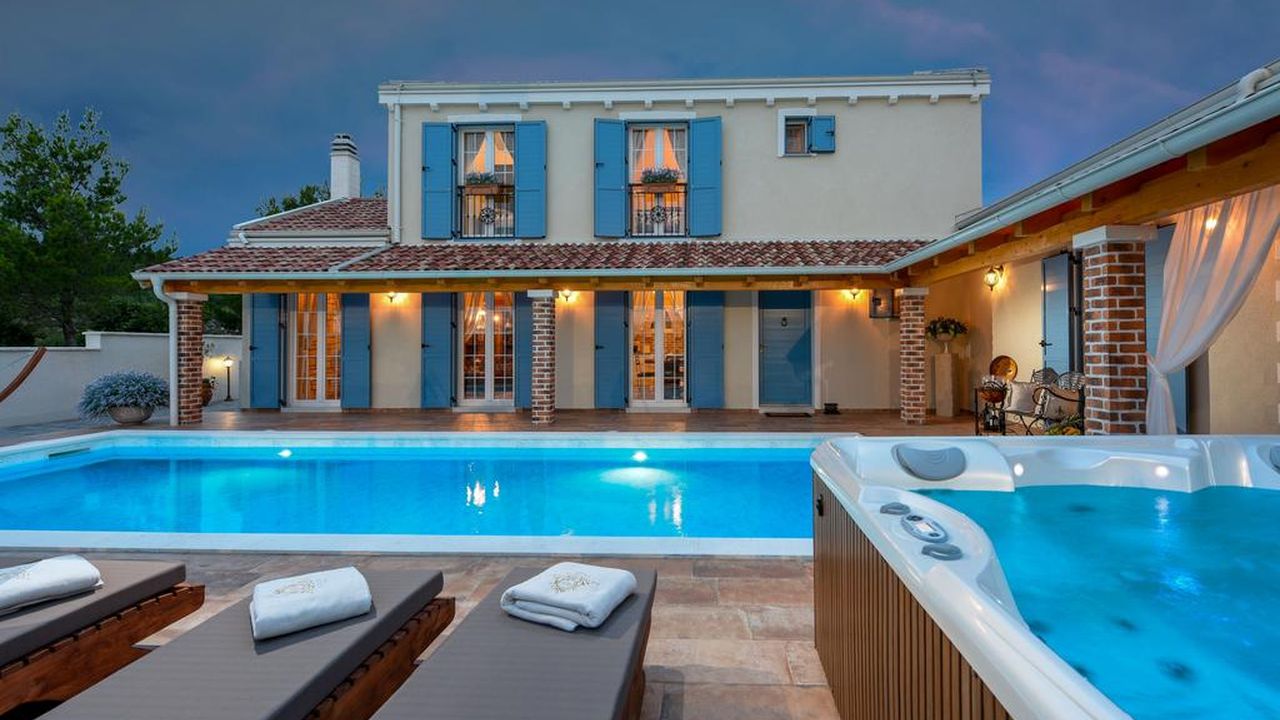 Villa-180m2 Plot-1200m2 3 Bedroom 3 Bathroom + 1 Toilet Airport Zemunik-18km Beach-300m Restaurant-1km Shop-500m Heated pool-40m2 Outdoor hot tube Private parking Every room is air-conditioned Every room has system for heating and floor heating.
