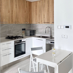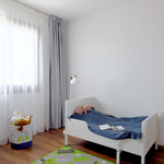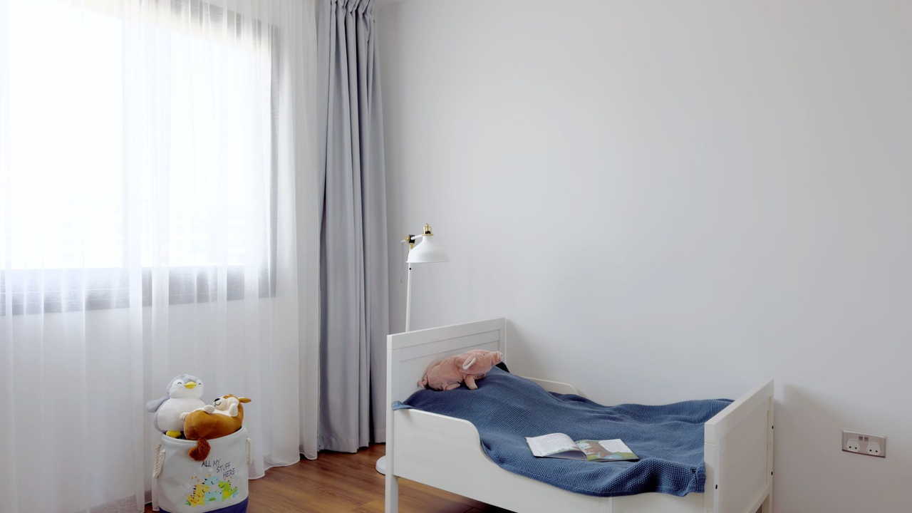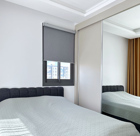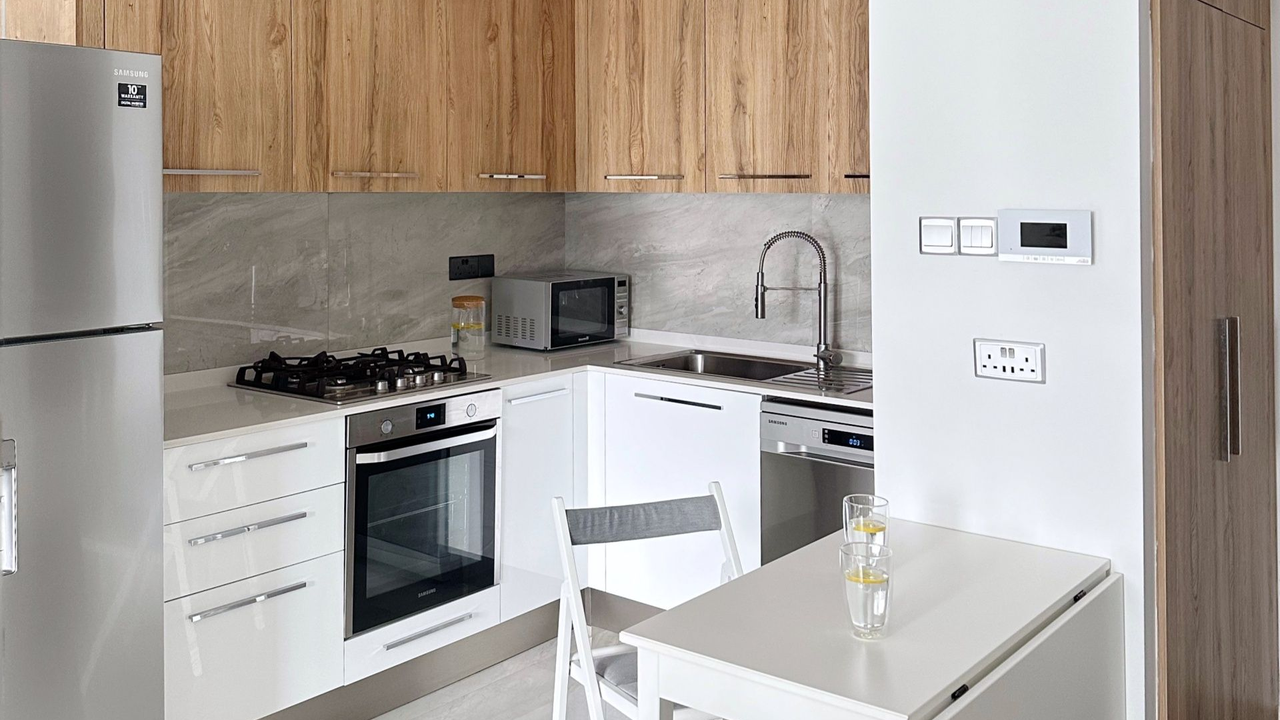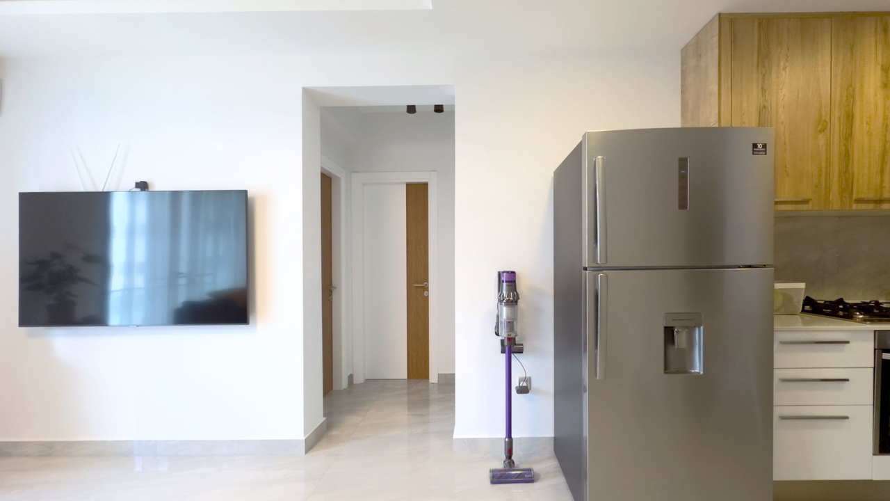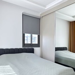 Кухня оборудована всей необходимой техникой: холодильник Samsung, варочная панель и духовой шкаф, посудомоечная машина, микроволновая печь, современная вытяжка. В апартаментах две отдельные спальни. Главная спальня с большой кроватью, шкафом-купе с зеркальными фасадами и рабочим столом у окна. Вторая спальня идеально подходит для ребенка: есть кровать, рабочий стол, стеллажи для игрушек и отдельный кондиционер.