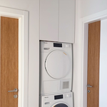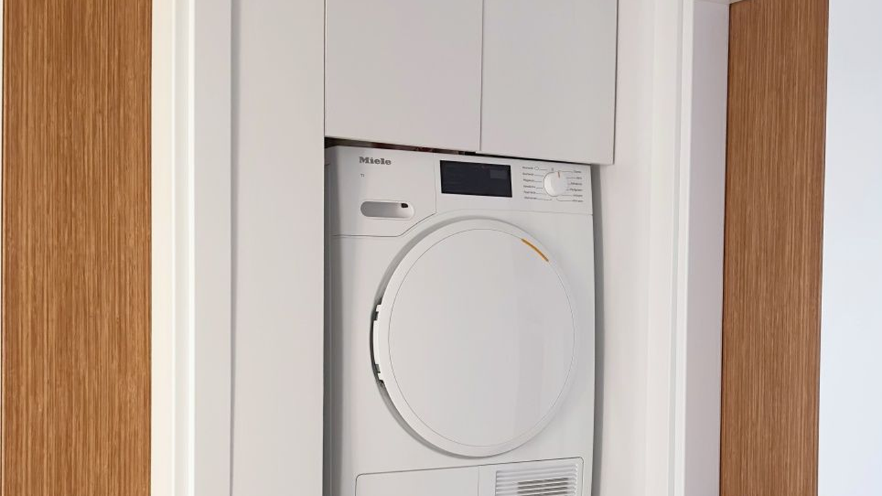 В коридоре отдельная зона для стирки с современной стиральной и сушильной машинами Miele, встроенные шкафы для хранения. Во всей квартире выполнена качественная отделка: керамогранитные полы, стильные светильники, текстиль подобран в спокойных тонах.