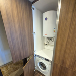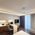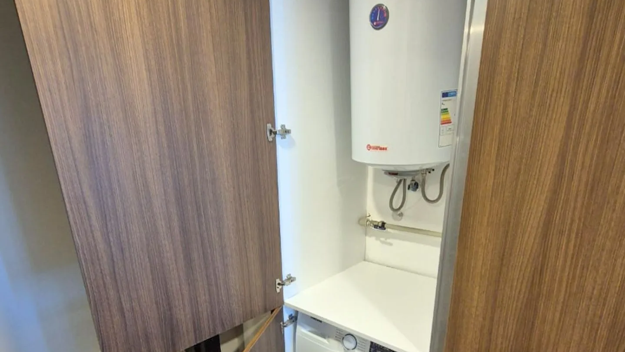 Современная студия площадью 53 м2 с балконом 11 м2 полностью меблирована и готова к проживанию. Пространство продумано до мелочей: уютная спальная зона с двуспальной кроватью и мягким изголовьем, удобный диван и зона отдыха у панорамных окон, из которых открывается вид на море и город. Кухня оборудована варочной панелью, духовкой, встроенной посудомоечной машиной, микроволновой печью, электрочайником и мойкой из нержавеющей стали. В отдельном шкафу предусмотрено место для стиральной машины и бойлера, что делает интерьер аккуратным и функциональным.
