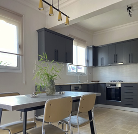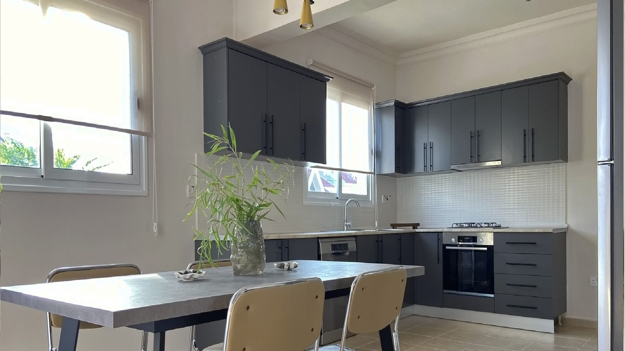 В гостиной есть диваны и кресла с износостойкой обивкой, ковры с восточными орнаментами и журнальные столики. Кухонный гарнитур выполнен из материалов высокого качества: матовые фасады в тёмно-сером цвете, прочная столешница из композита, большая рабочая поверхность и удобная система хранения. Установлена встроенная техника Bosch: духовка, плита, вытяжка, посудомоечная машина и холодильник.