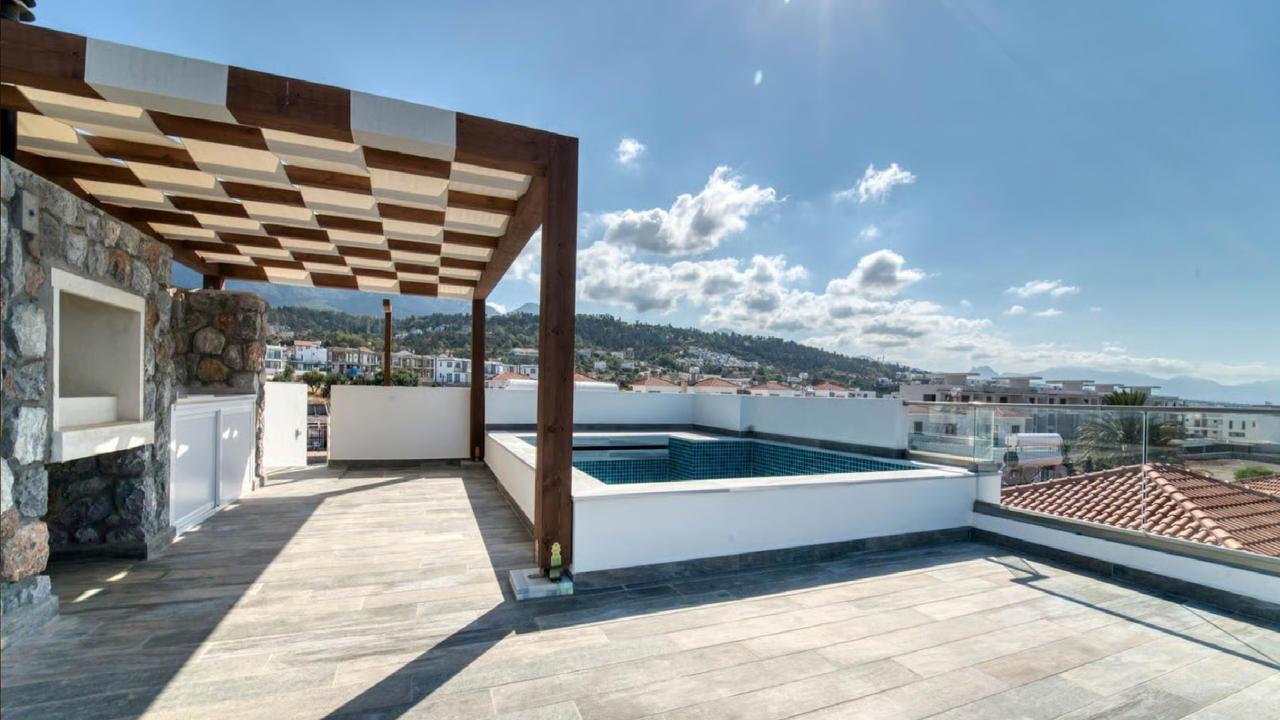 Пентхаус 3+1 общей площадью 104 м2 с балконом 10 м2 и большой частной террасой на крыше 70 м2 с бассейном. Из каждой комнаты открываются невероятные панорамные виды на море. На крыше обустроена полноценная приватная зона отдыха: бассейн 12 м2 с подсветкой, душ, барбекю-зона, кухня с каменной столешницей, раковиной, водой и местами для хранения, а также аккуратно отделённая техническая зона с оборудованием от кондиционеров. У каждой квартиры в этом комплексе отдельный вход.