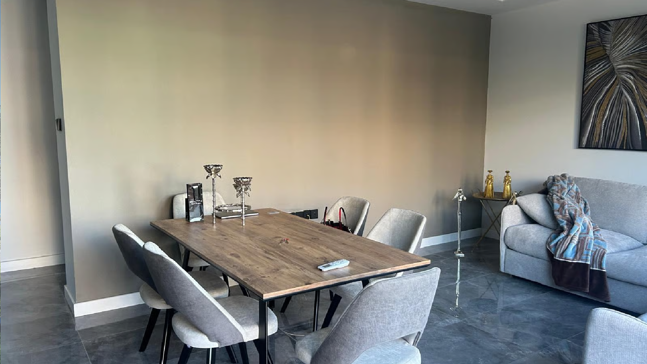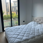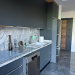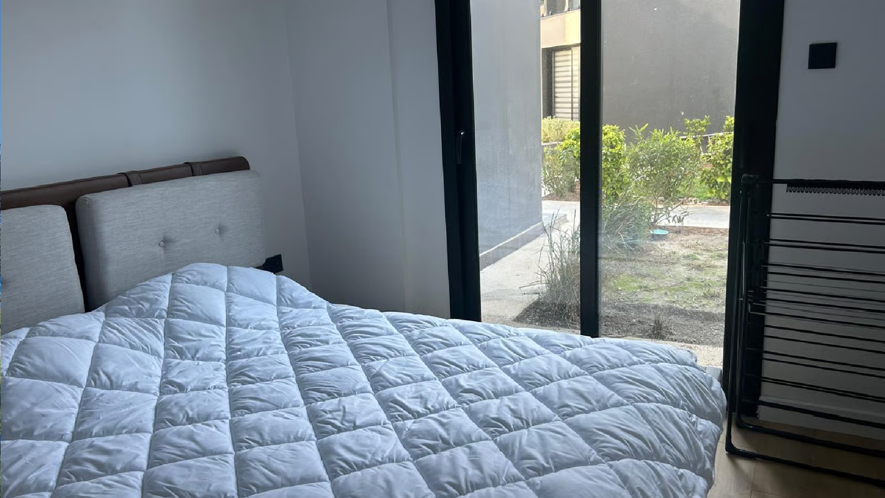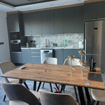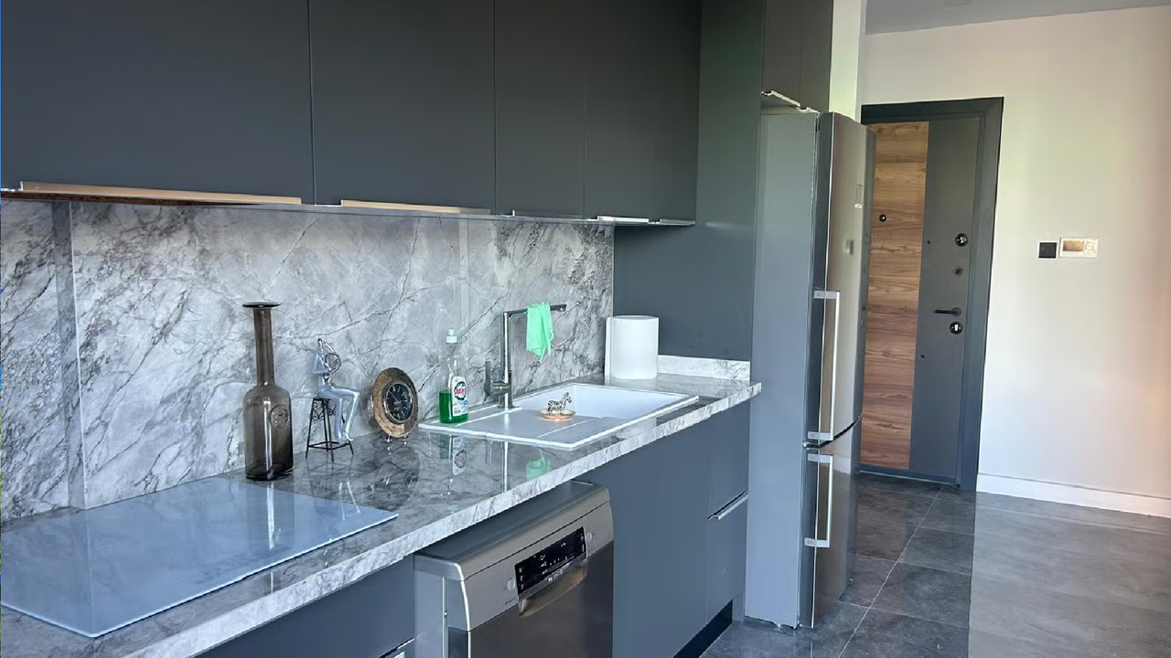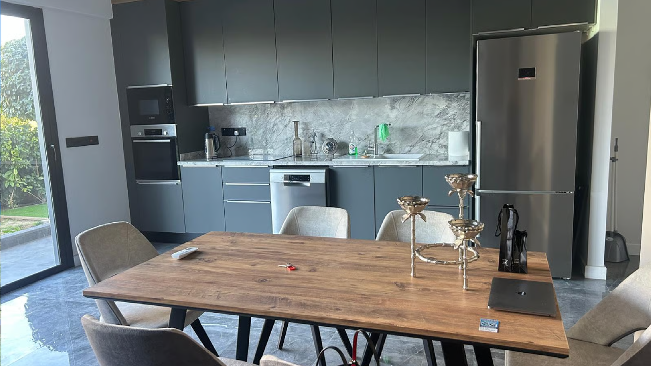 Апартаменты 2+1 площадью 85 м2, расположены в Кирении. Мебель и техника включены в стоимость, что делает квартиру полностью готовой к заселению. Интерьер включает просторную гостиную, объединённую с кухней открытого плана, оснащённой встроенной бытовой техникой, включая духовой шкаф, микроволновую печь, варочную поверхность, вытяжку, посудомоечную машину и холодильник. В гостиной установлен обеденный стол с комплектом стульев и большой угловой диван. В квартире две уютные спальни с большими окнами, из которых открывается вид на сад.