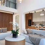 Общая площадь пентхауса составляет 218 м2, из которых 103 м2 занимают балконы и террасы, идеально подходящие для отдыха и развлечений. При входе в пентхаус вы окажетесь в просторной прихожей с вместительной гардеробной, которая продумана для удобного хранения вещей, и ведущая в гостиную с панорамными окнами, откуда открывается потрясающий вид на море.