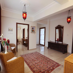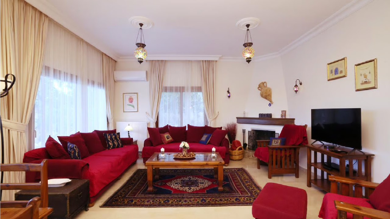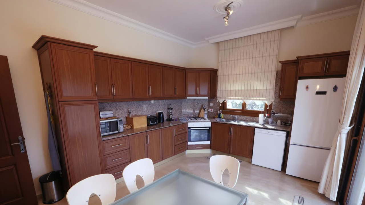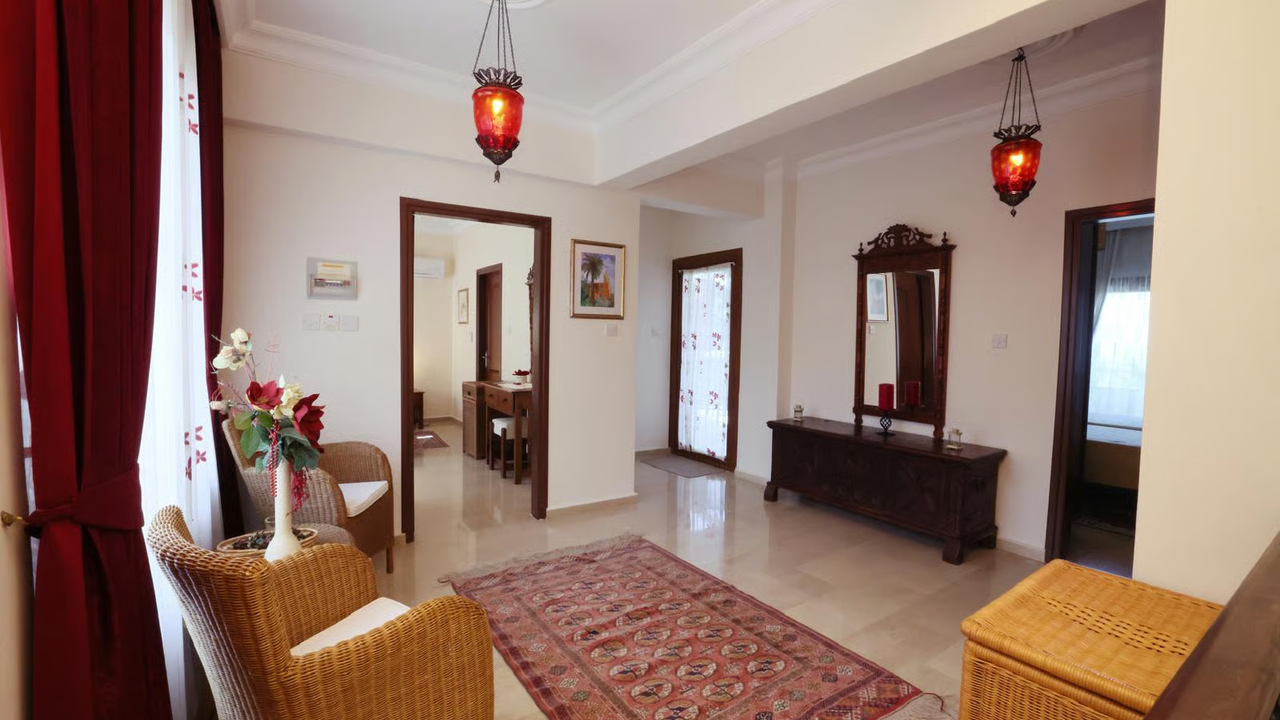 На первом этаже вас ждёт просторная гостиная с уютным камином, где можно проводить вечера в кругу семьи. Дом украшен тремя антикварными коврами с паспортами подлинности. Из холла на втором этаже открывается выход на просторную террасу площадью 24,5 м2. Кухня с гранитными столешницами, отделённая от гостиной, оборудована современной техникой. В интерьере использованы изделия из натурального дерева, изготовленные на заказ лучшими кипрскими мастерами.