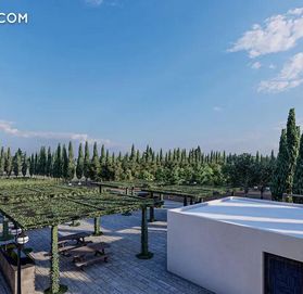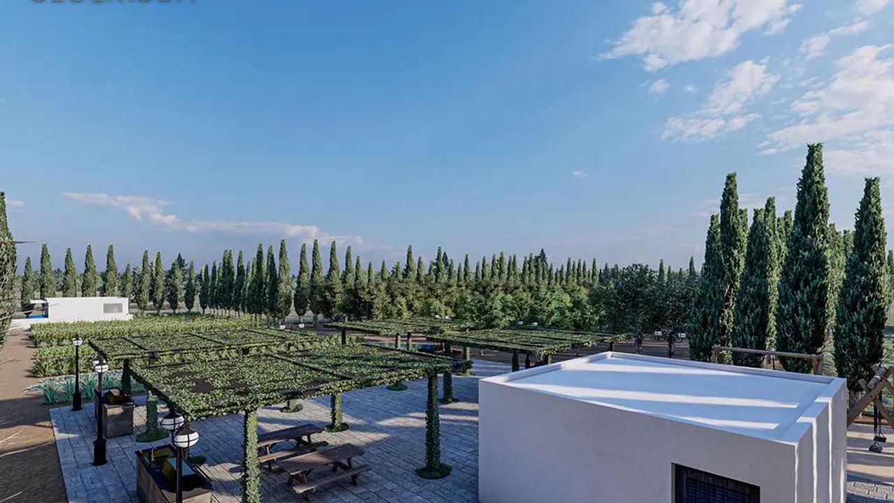 Большая площадка для барбекю на сельскохозяйственном участке с традиционной печью, беседками, кухонными стойками, детской площадкой и туалетами.