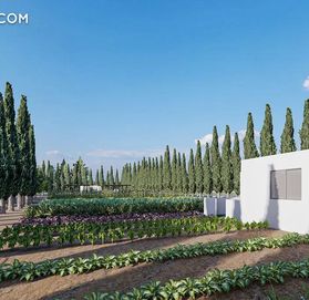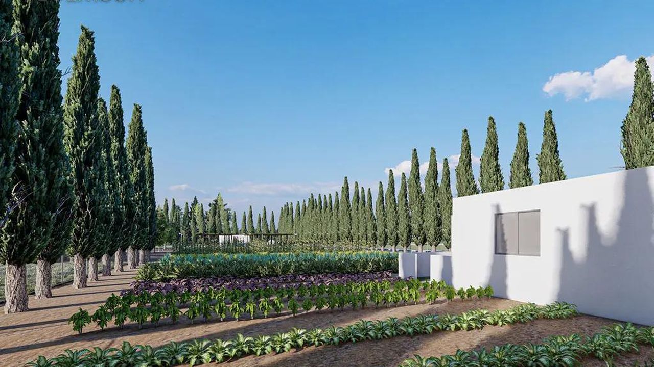 Совместный сельскохозяйственный участок с овощами, деревьями и т. Д. На обратной стороне проекта.