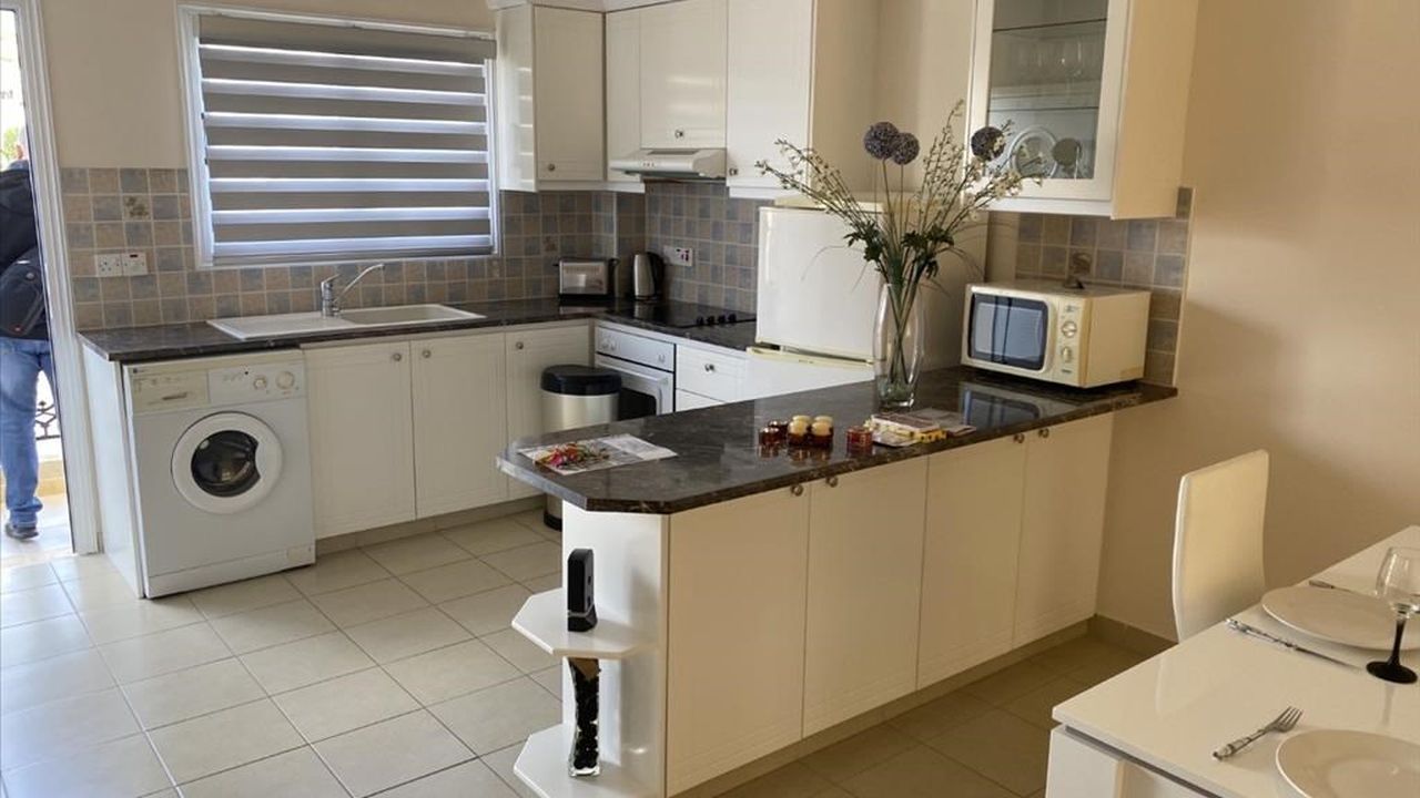 Продается квартира площадью 89 кв.м В Пафосе. Квартира расположена на 3 этаже и состоит из 2 спальных комнат, гостиной с кухней, одной ванной комнаты, одной душевой комнаты. Из окон открывается вид на море. У объекта есть солнечные батареи для нагрева воды, кондиционер. Недвижимость продается с мебелью. В здании расположен лифт. К недвижимости относится парковочное место. В распоряжении владельцев общий бассейн на территории.